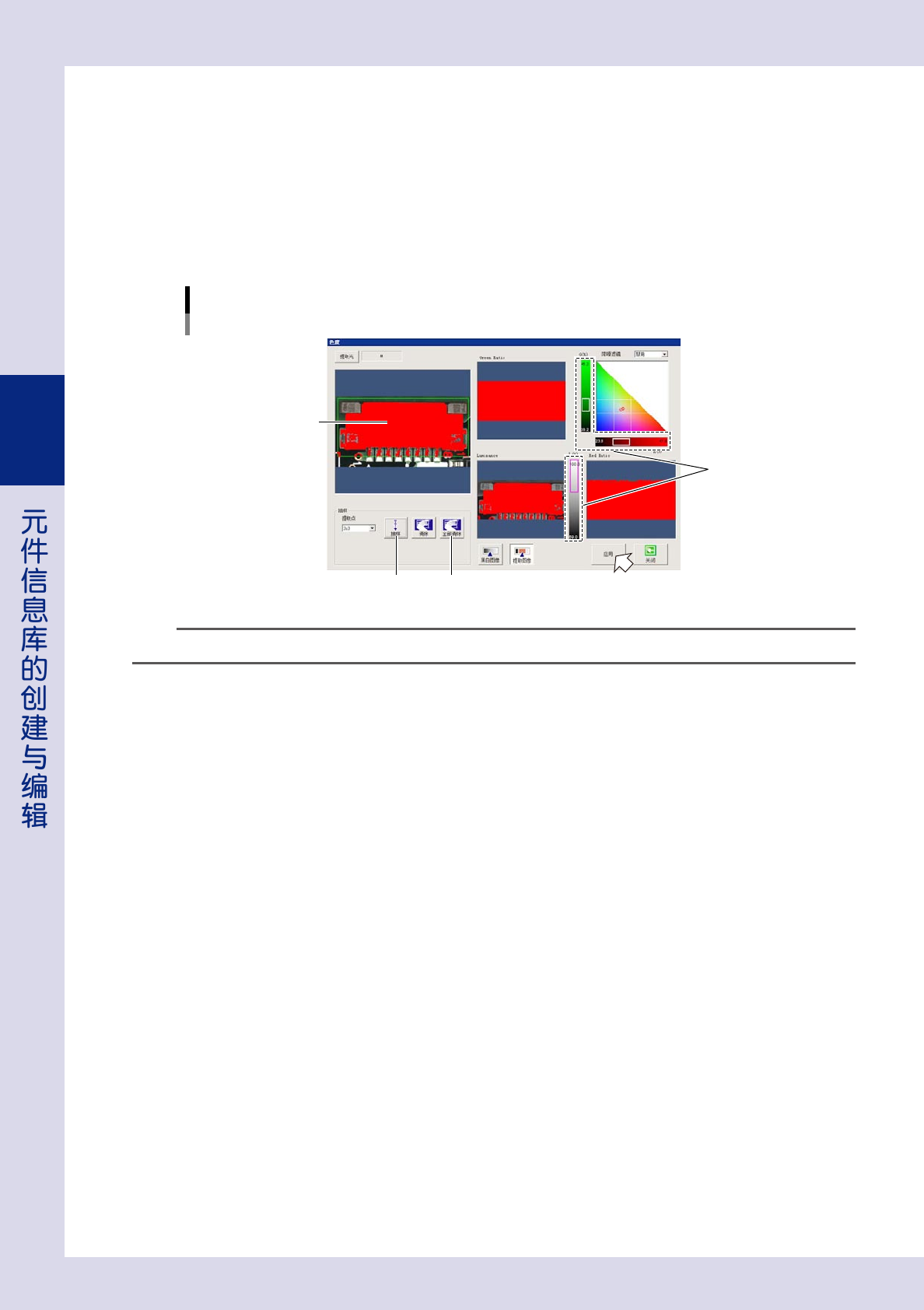 5. 继续使用 3 个亮度值滑动条调节亮度值,使检查对象物显示为红色。“Green Ratio”、“Red Ratio”、