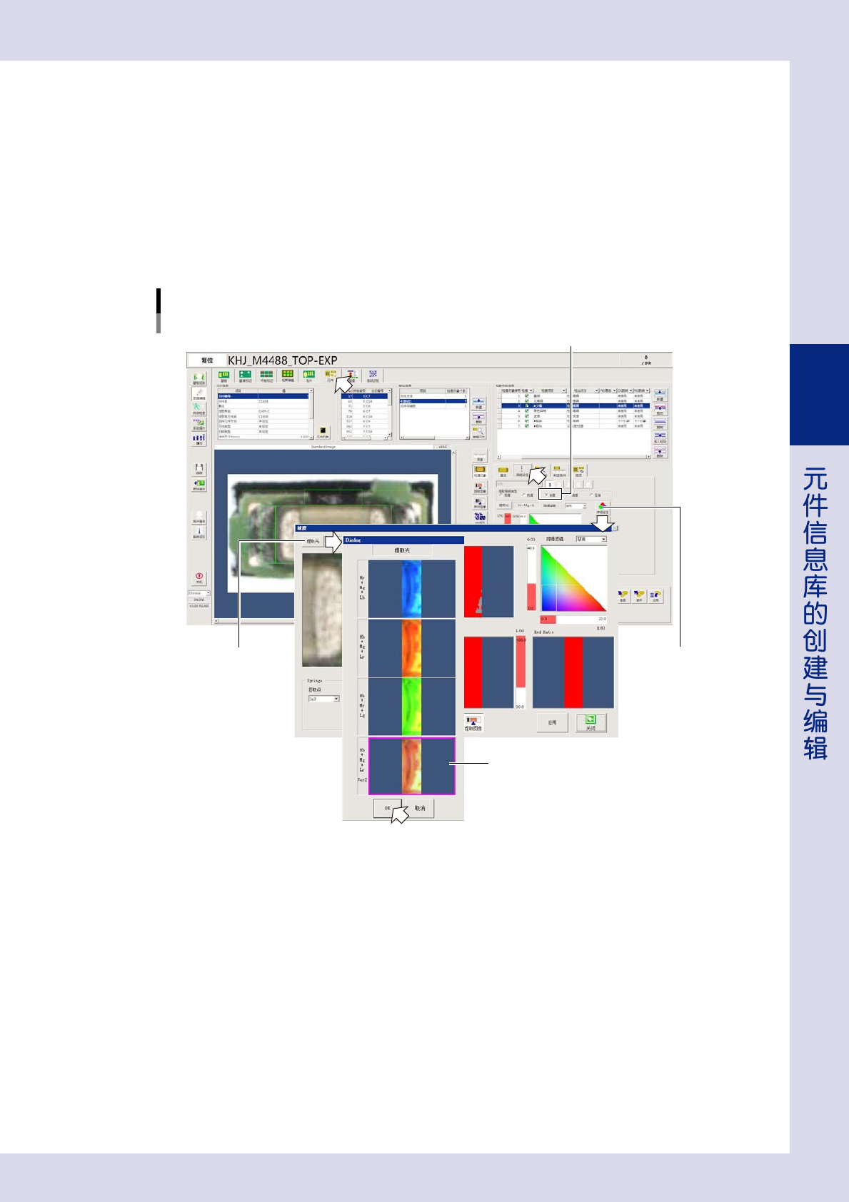 3-29 3 ■ 坡度 坡度,是按倾斜度对焊角等进行提取,将所提取的区域作为检查对象。 下面,介绍将“提取照明类型”设置为“坡度”时的设置方法。 1 选择提取光。 1. 将“提取照明类型”选择为“坡度”之后,按 [ 详细设定 ] 按钮。 2. 按坡度画面的 [ 提取光 ] 按钮,从提取光列表中选择 1 个检查对象物的反差明显的图像 ( 一般选择 Hb+Mg+Lr Ver2)。 3. 按 [OK] 按钮,保存设置。 提取照明类型:坡度 提…