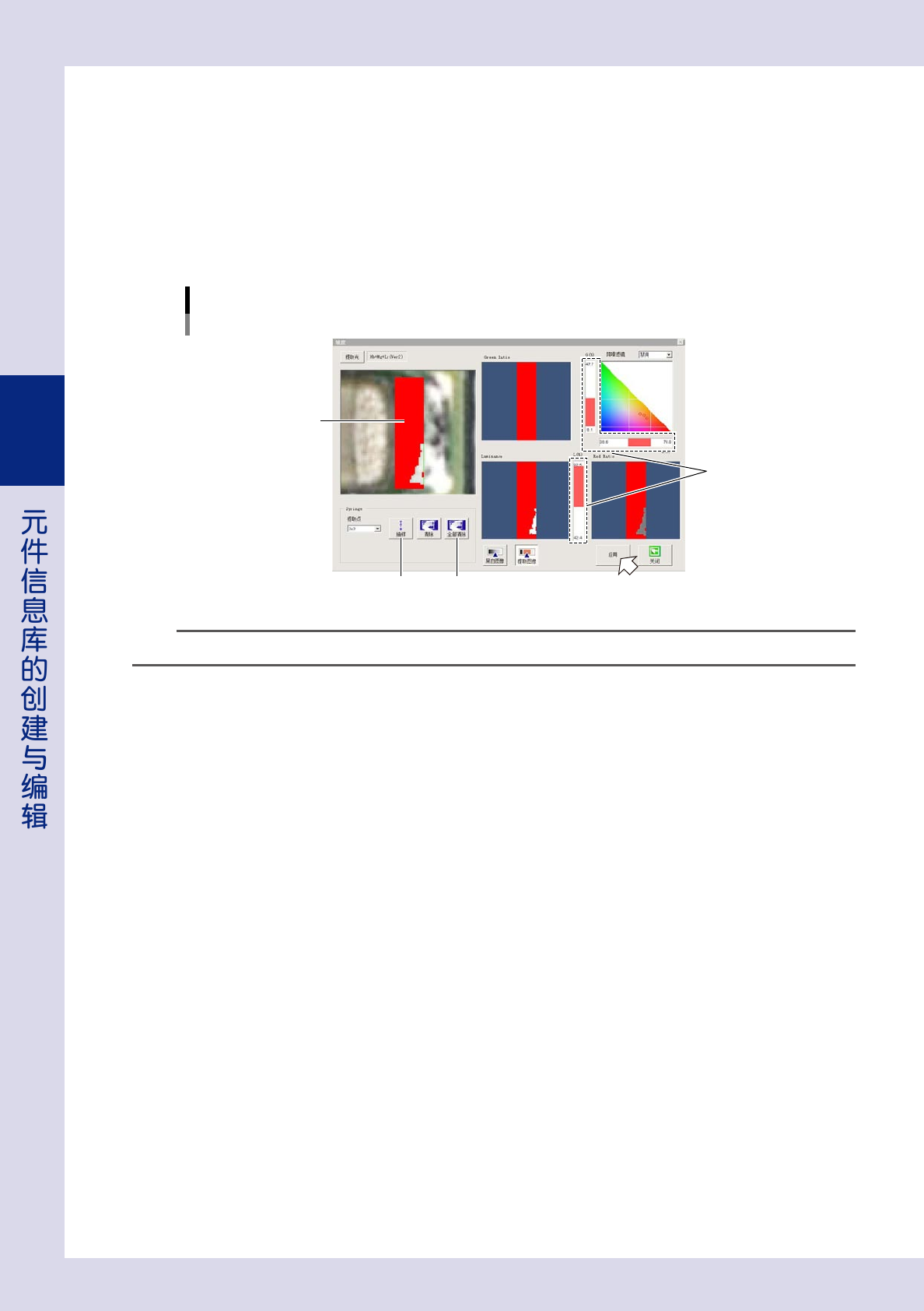 5. 继续使用 3 个亮度值滑动条调节亮度值,使检查对象物显示为红色。“Green Ratio”、“Red Ratio”、