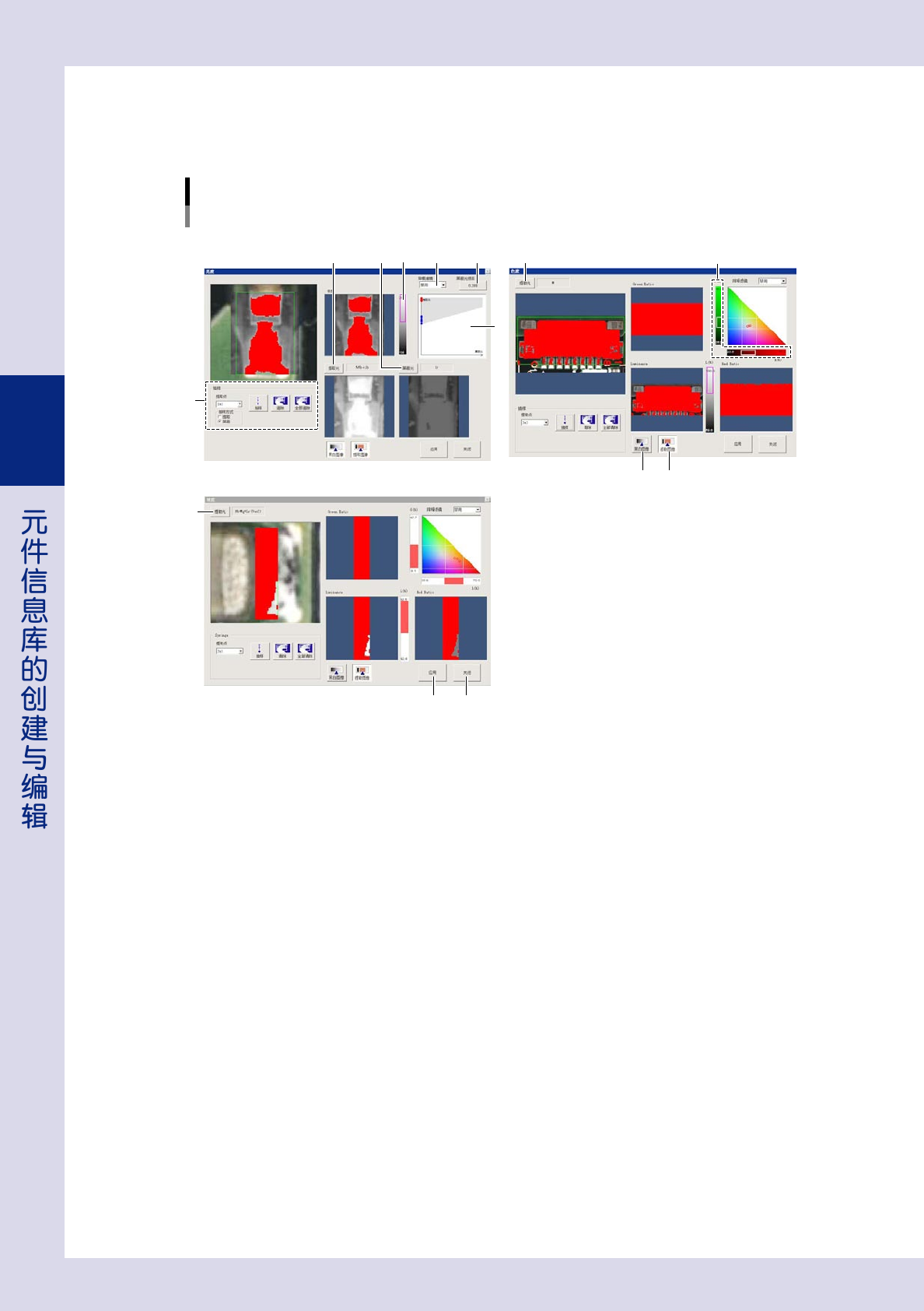 3-35 3 4. 亮度值滑动条 用鼠标拖动滑动条调节亮度值。 5. 降噪滤镜 选择滤镜的大小,消除噪点对图像的影响。 6. 屏蔽光倍率 设置进行图像运算处理时屏蔽光的倍率。按该按钮,可以打开屏蔽光倍率对话框输入任意的倍率。 7. 亮度值范围 灰色部分显示亮度值的范围,若按 [ 提取图像 ] 按钮,将以红色显示。设置了屏蔽光时,可以拖动灰色部分调节屏蔽光倍率。 8. [ 黑白图像 ] 按钮 按该按钮,左上图像中的检查对象显示为黑白图像。…