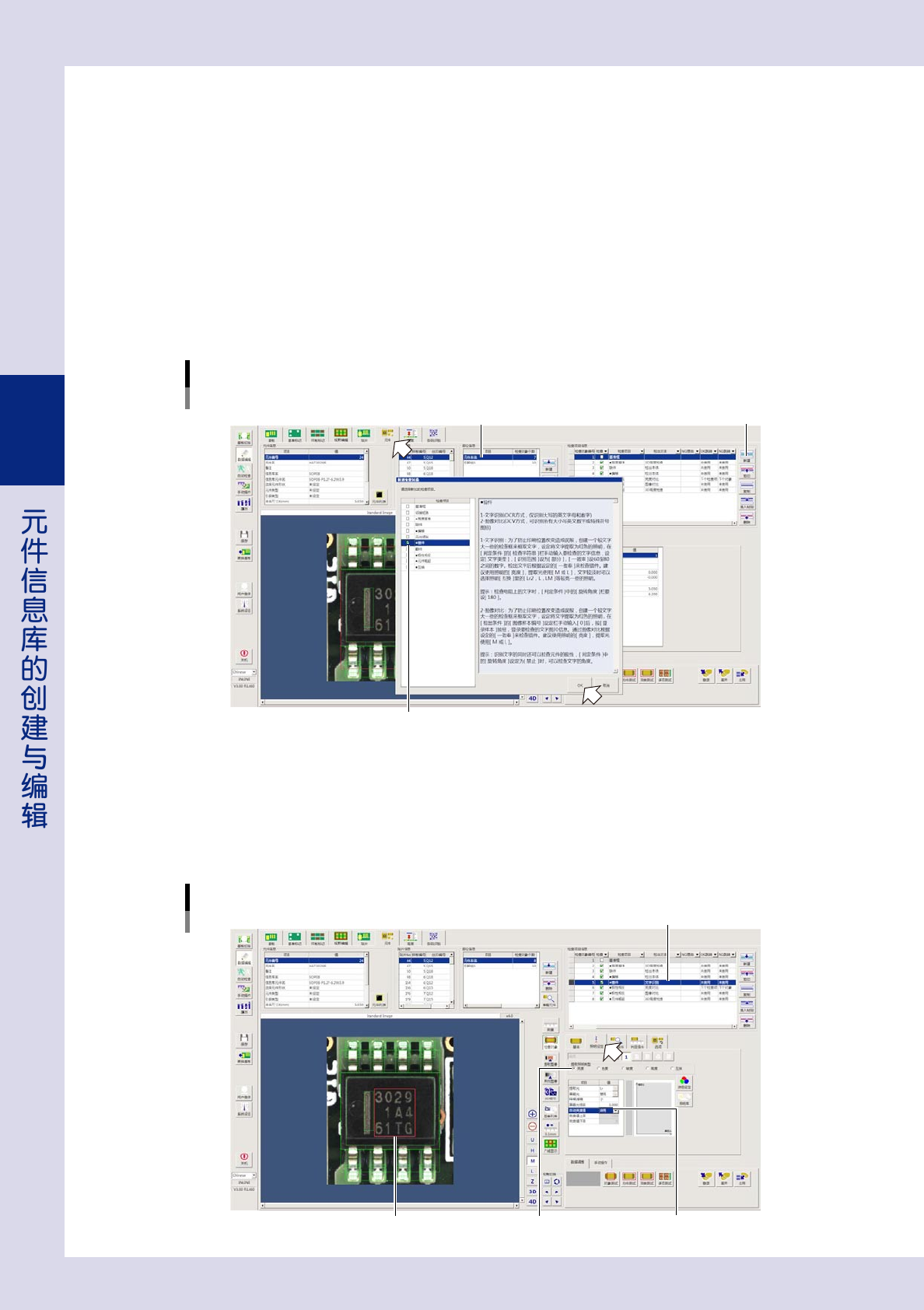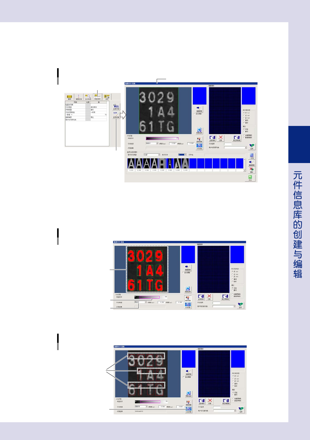 3-36 3 2.4.2 用户字符的登录 “文字识别”检出方法,是通过与预先登录在字符模板中的字符进行对比来检查的。字符模板中没有登录的字符, 可以登录之后再使用。 ■ 登录新的字符 下面,介绍在字符模板中登录新字符的方法。 1 创建“文字识别”的检查对象。 1. 在“部位信息”中选择“元件本体”之后,按“检查项目信息”中的 [ 新建 ] 按钮。 2. 选择“错件”或“极性相反”之后,按 [OK] 按钮。 3. 将“检出方法”设置为“文…