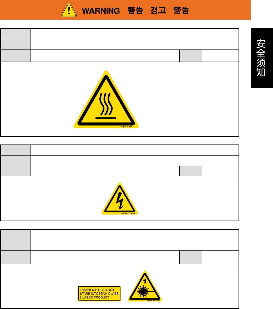 xiv 3.2.3 对人体的影响 危险结果 有触电的危险。 安全防范 请勿用手触摸或拆卸电极。请勿向电极淋水。 对象 配备静电消除器 ( 选配 ) 的机器 警告阶段 所有作业 可造成触电和故障的原因。 别用手触摸电极部位。 不可私自拆分部件。 请避免部件接触水分并远离极度潮湿环境。 To prevent the electric shock or damage. Do not touch electrodes. Do not disas…