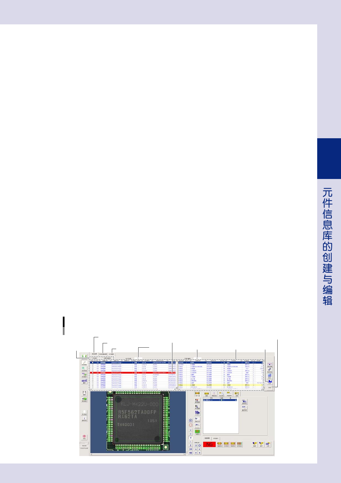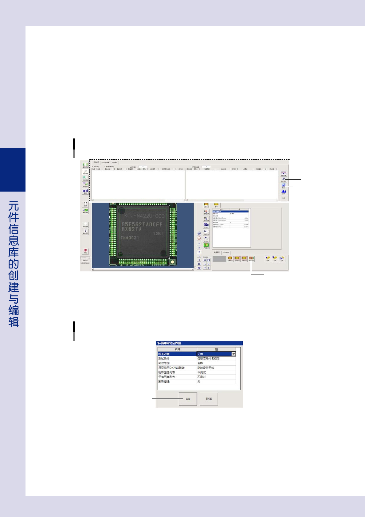 3-46 3 2.4.5 检查对象的数据调整 创建完检查对象之后, 需对检查对象进行测试。 若测试结果为 NG, 需对该检查对象的各项参数进行数据调整 ( 修改 )。 确认检查对象的测试结果, 使用“元件”画面右下部的“数据调整”选项卡中的按钮。修改参数, 请参阅后述“第 4 章 检查项目的设置” 。 ■ 多项测试 多项测试, 是通过设置测试条件对检查对象进行测试。例如, 创建了新的信息库时, 可以指定“信息库元件名相同” 为测试条件,…