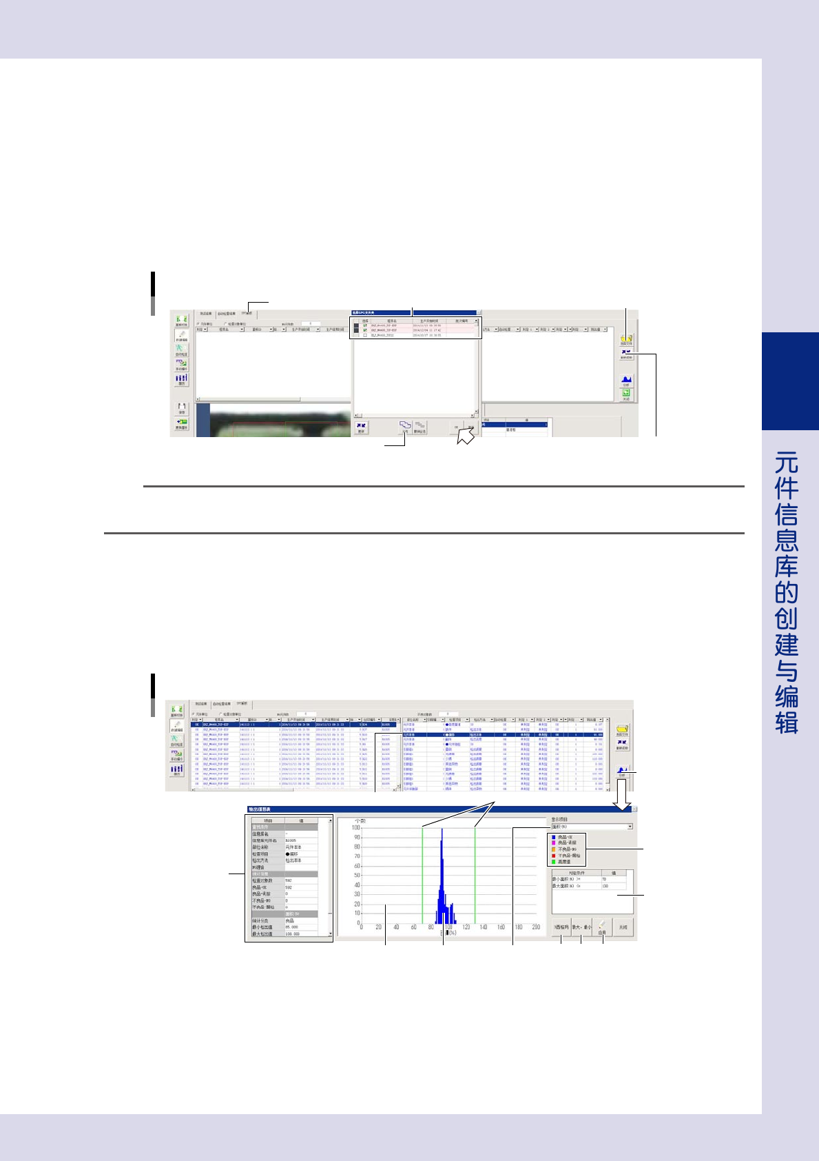 3-50 3 2.4.6 测定结果 按“元件”-“数据调整”选项卡中 [ 对象测试 ] 按钮对检查对象进行了测试之后,按“检出条件”选项卡画面中 的 [ 测定结果 ] 按钮,可以打开“检查结果”画面。在该画面中可以查看该检查对象范围内检测得到的结果数据。 “检查结果”画面 1 2 3 ■ 以检出方法为“检出引脚”为例 ■ 以检出方法为“文字识别”为例 5 [测定结果]按钮 「检出条件」选项卡 4 1 5 4 26361-P7-00 1.…