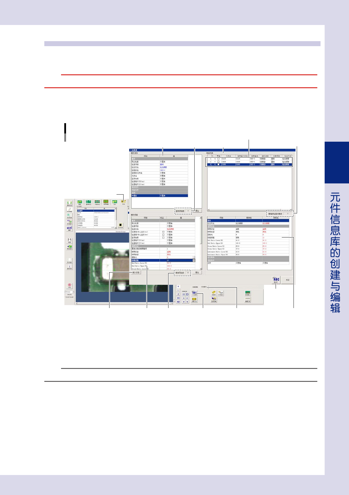3-56 3 4 指定更改项目。 在画面左下的“更改项目”中输入想要更改的值。不想更改的项目,设置为“不置换” 。 想要更改检查对象的“照明设定”时,按 [ 倒入设定 ] 按钮,设定值会自动输入。 确认“替换项目数”显示框中显示的个数是否与想要更改的项目个数一致。 参考 “更改项目”中显示的项目随“检查项目”与“检出方法”的不同会有所不同。 5 确认替换内容列表中的显示。 画面右下的替换内容列表中会显示将被替换的项目。 确认“替换前”与…