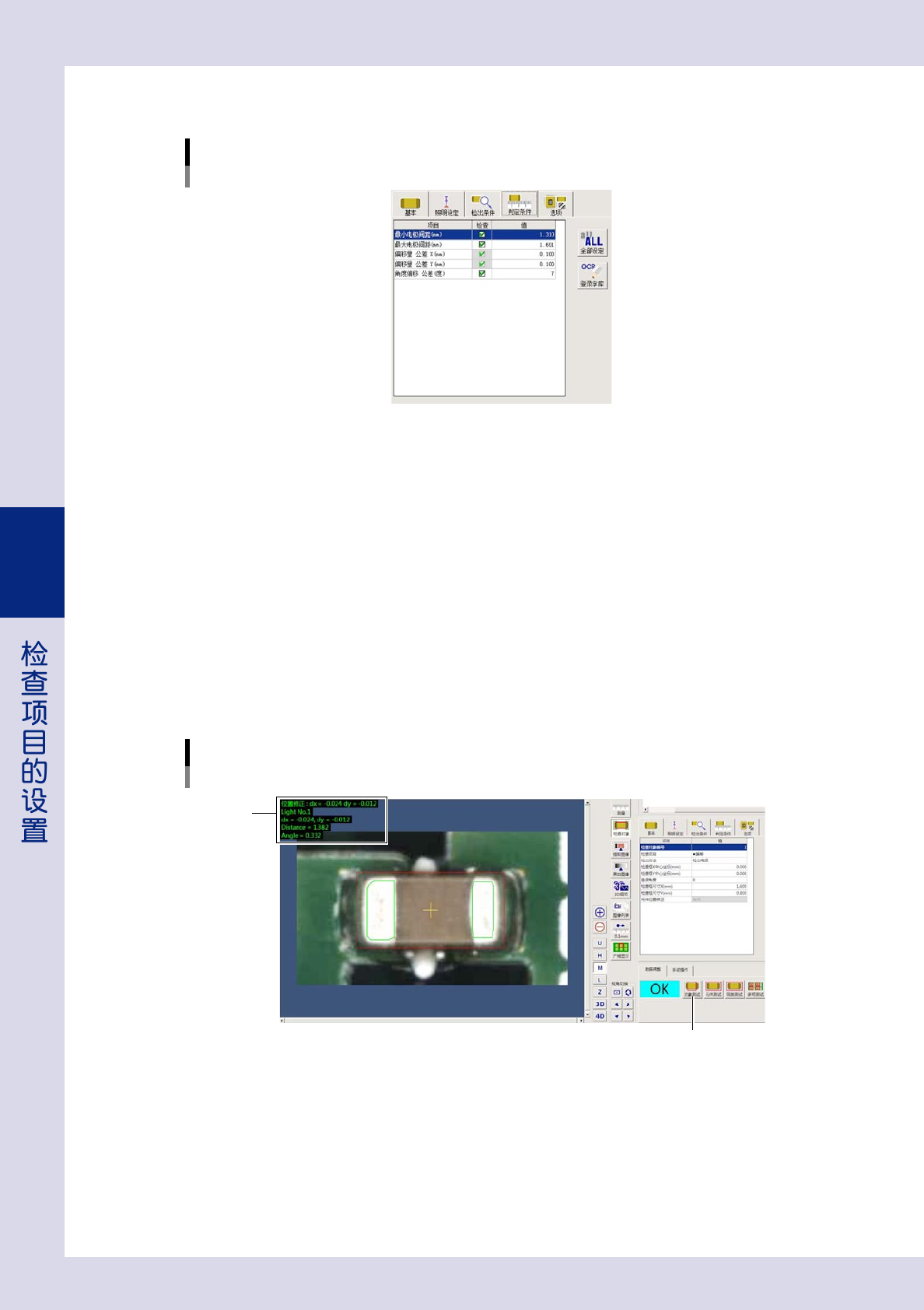 4-9 4 2.3 文字识别 通过识别印刷在元件上的文字,判定错件或极性是否相反。 对象检查项目 : 错件、极性相反 1 设置检出条件参数。 检出条件参数 检出方法:文字识别 26407-P7-00 提取尺寸 选择“自动”或“手动”设置识别文字时的最小尺寸。 选择“手动”时,需输入“文字尺寸 X、Y(mm)” 。一般,选择“自动” 。 位置修正类型 选择进行位置修正时的位置基准。 位置修正方式 该参数只有“位置修正类型”的设置为“无效”…