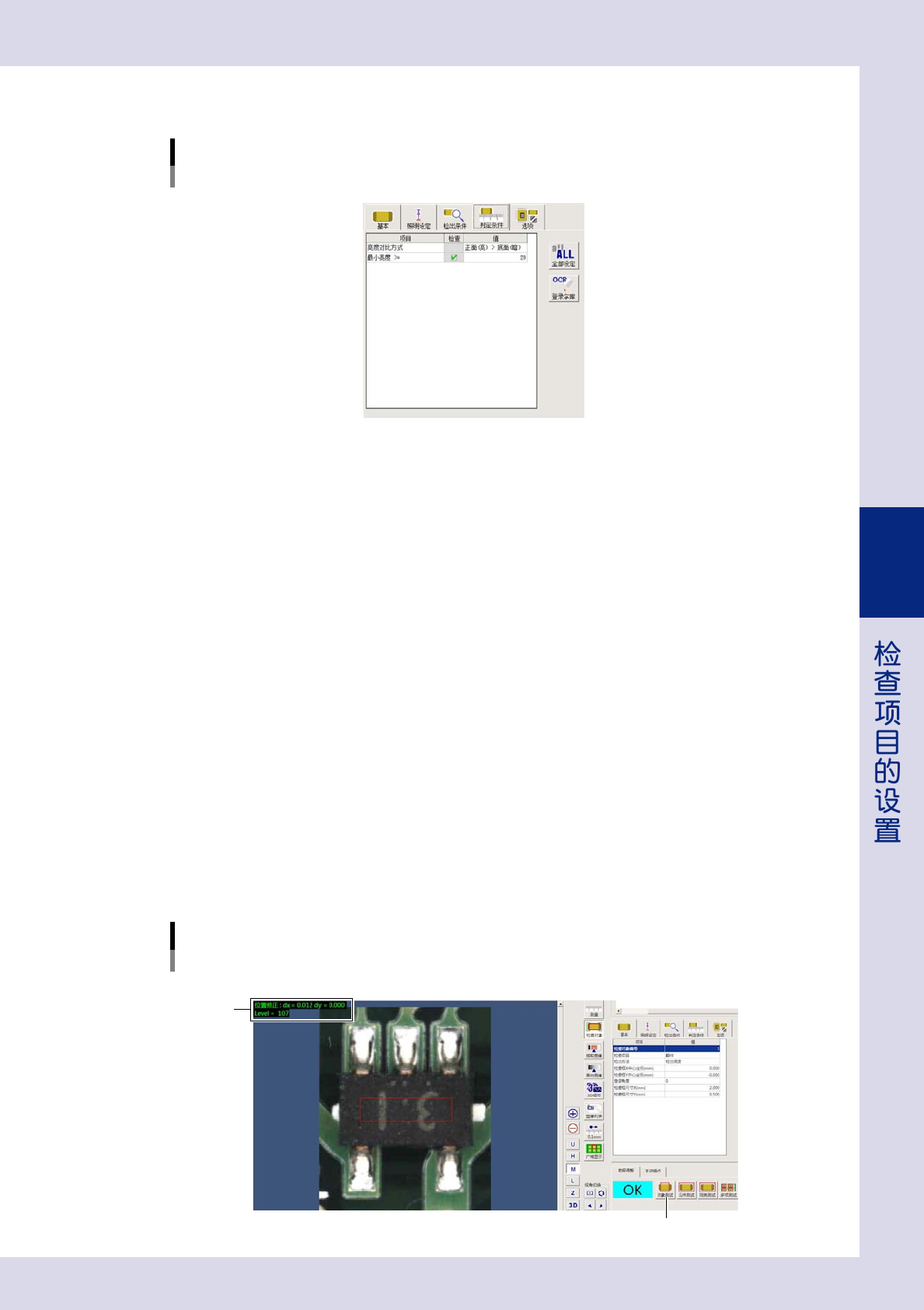 4-23 4 2 设置判定条件参数。 判定条件参数 检出方法:检出亮度 <以“翻件”为例> 26426-P7-00 亮度对比方式 ‧ 正面 ( 亮 ) >底面 ( 暗 ) : 元件正面的亮度比底面的亮度亮时选择。 ‧ 正面 ( 暗 ) >底面 ( 亮 ) : 元件正面的亮度比底面的亮度暗时选择。 对象检查项目 : 翻件 最小亮度>= 设置元件正面与底面的最小亮度差。 检出的亮度之差大于或等于此处设定的值时,判定为 OK。 对象检查项目 …
