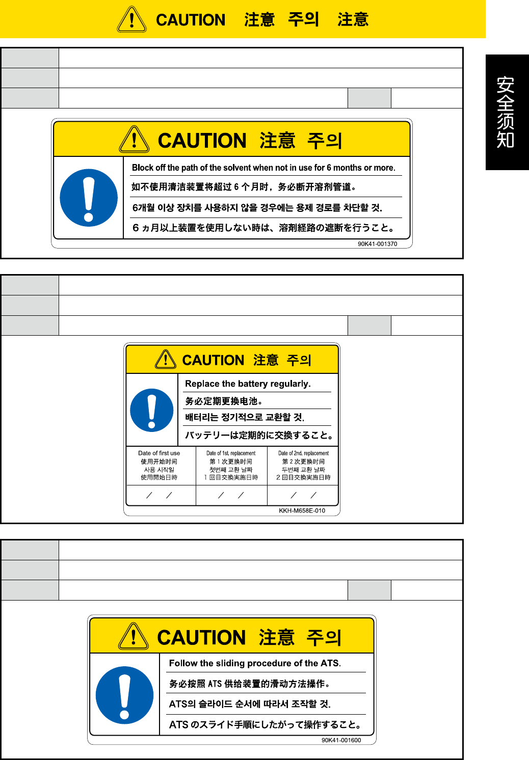 xxi 危险结果 有损坏机器的危险。 安全防范 如果不使用清洁装置将超过 6 个月时,为保护溶剂泵,务必断开溶剂管道。 对象 印刷机所有机型 警告阶段 维修保养 危险结果 可能会损坏功能。 安全防范 电池有使用寿命,务必定期更换。 对象 配备 UPS ( 选配 ) 的机器 警告阶段 维修保养 危险结果 可能会损坏机器。 安全防范 务必仔细阅读操作手册并按照正确的操作步骤操作。 对象 YS24X ( 装配有 sATSII 的机器 ) 警告…