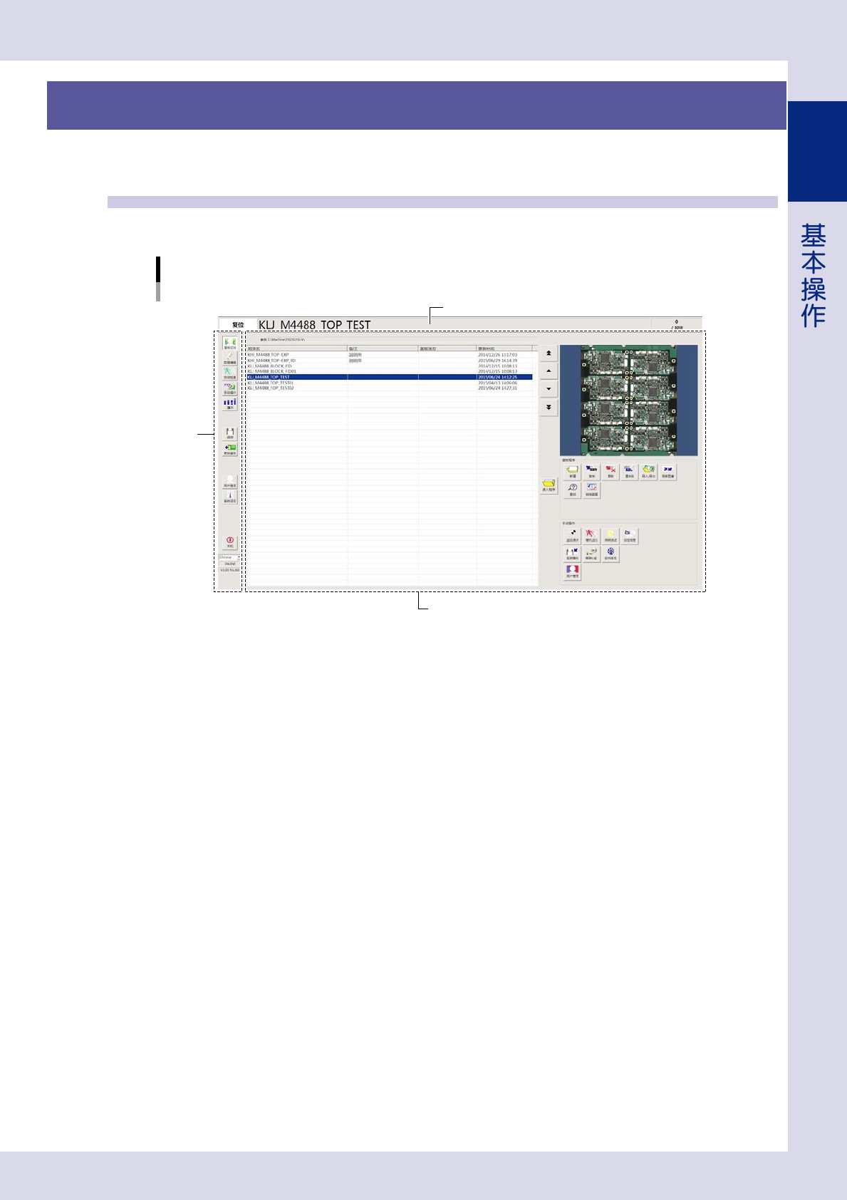 本章节,介绍检查机软件画面的基本构成与操作方法。请在操作检查机之前阅读。
