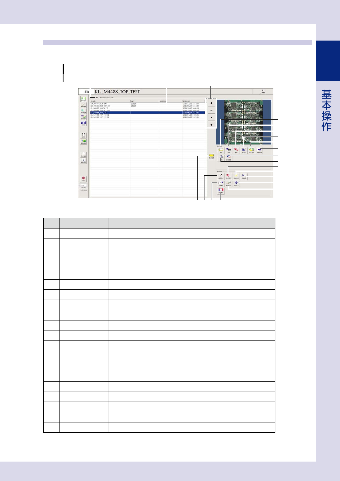1-3 1 1.3 “基板切换”画面 在基板切换画面,可以管理检查程序与进行各项设置。下面,介绍画面中显示的项目与各个按钮的功能。 “基板切换”画面 6 5 3 1 2 4 7 8 9 10 11 12 13 14 15 16 17 18 19 20 26102-P7-00 项目、按钮名 功能 1 参照 显示保存检查程序的位置。 2 程序列表 以列表的形式显示所保存的检查程序。 3 选程序用按钮 选择程序列表内的程序。 4 读入程序 读…