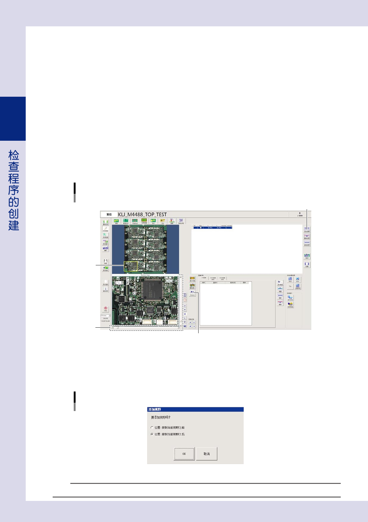 2-34 2 3.4.3 手动创建视野的步骤 没有 CAD 数据等无法转换为检查程序时,必须在想要检查的位置创建视野,并在视野中创建检查对象。 下面,介绍创建视野的步骤。创建视野必须在检查机上进行,iPro 离线编程软件 ( 选配 ) 无法创建视野。 1 打开“视野编辑”画面。 按 [ 数据编辑 ] 按钮,选择“视野编辑”选项卡。 2 将基板传入检查机内。 3 将 1 号视野移到想要检查的位置。 1 号视野创建在视野分布图的左下方,以黄…