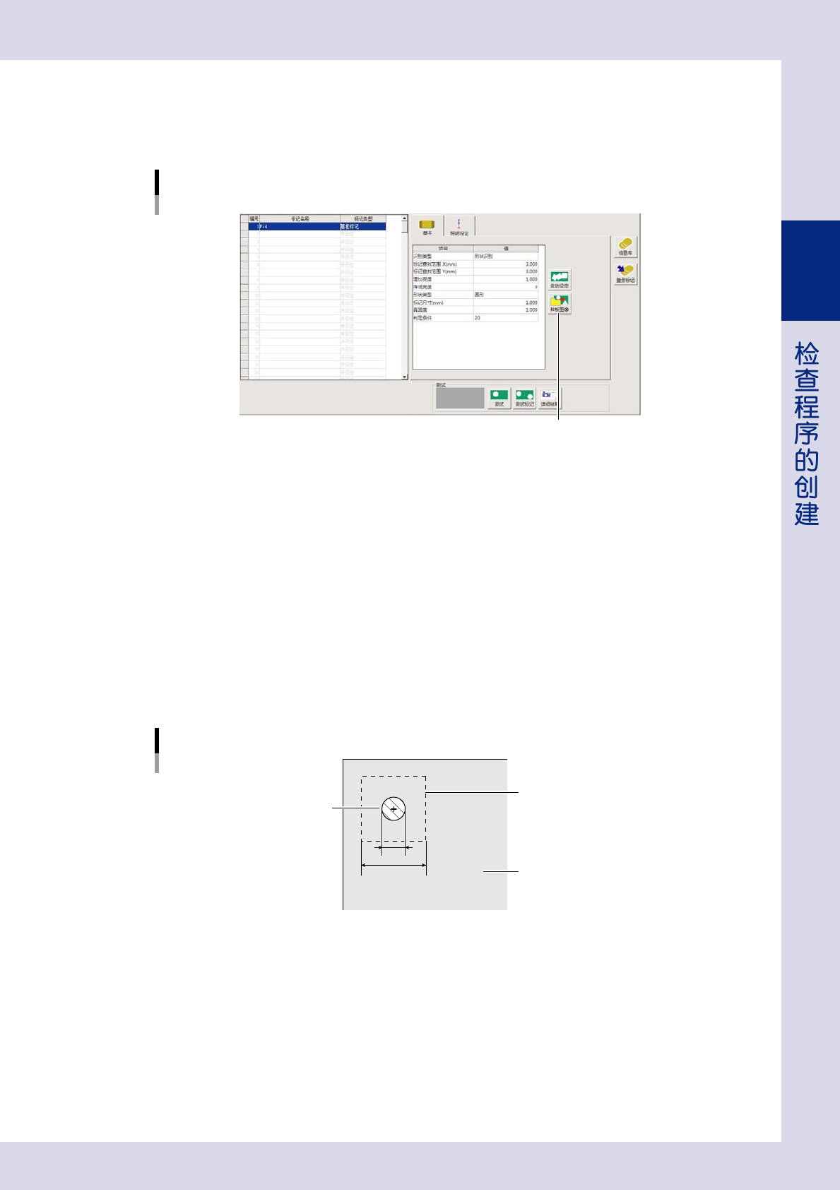 2-22 2 形状类型 形状类型有下列 3 种。根据使用的标记形状,从下拉框中选择使用。 形状类型 说明 例 圆 标记形状为圆形时选择。 正方形、长方形 标记形状为正方形、长方形时选择。 特殊形状 标记形状为圆形、正方形、长方形以外的 1 个整体形状时选择。 标记尺寸 (mm) 输入标记的外形尺寸。 如果不知道标记的外形尺寸,可以使用自动输入。 按 [ 自动设定 ] 按钮后,拖动鼠标框住标记,可以自动输入识别到的外形尺寸,并进行…