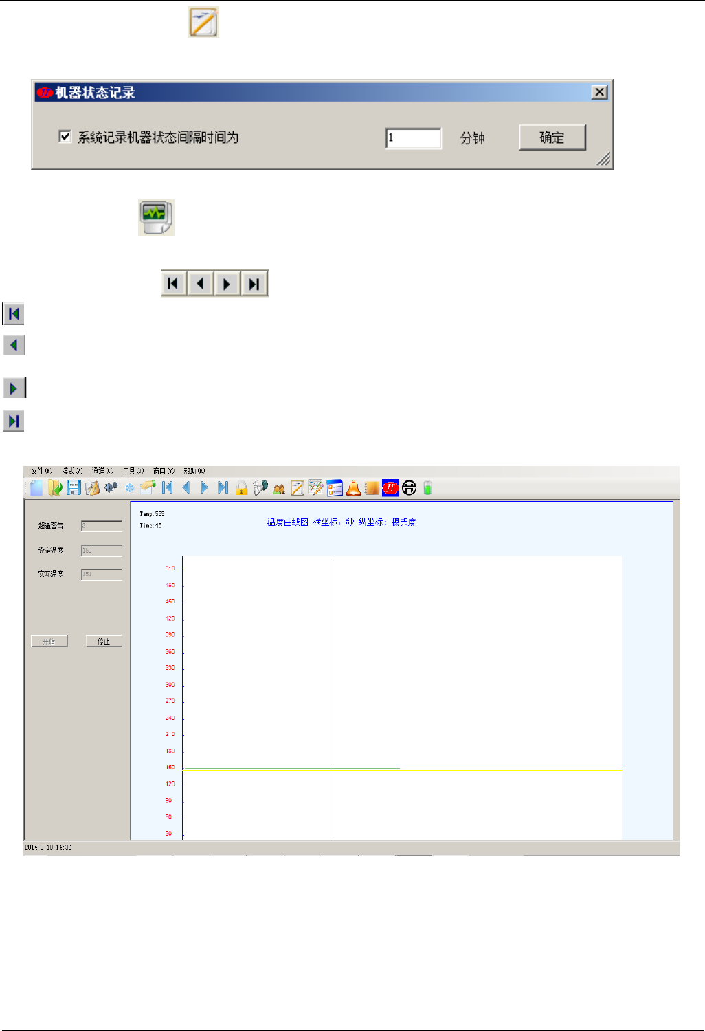 前一个选项,单击此选项,用户可查看到当前通道前一通道有关参数及监控曲线或当前记录的前一条机器状