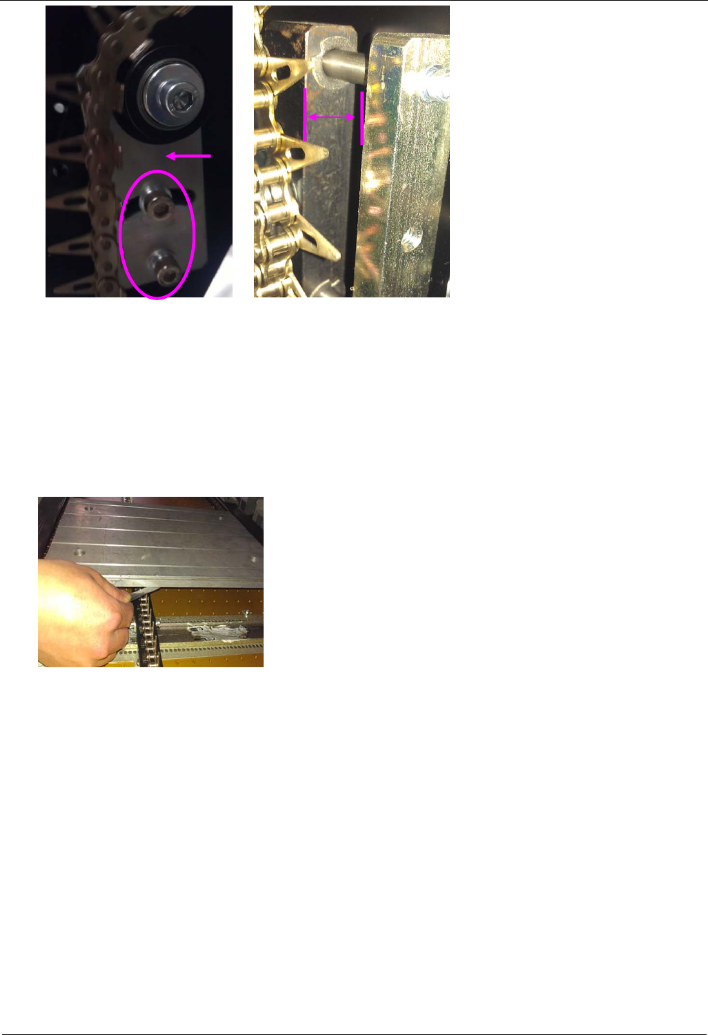 操作方法:松开张紧块固定螺丝,按箭头方向调整张紧块,当链条张力合适后(出口张紧机构间隙达到