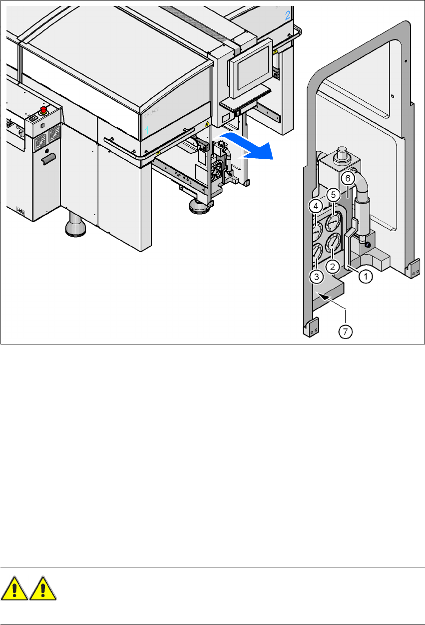 Driftsvejledning SIPLACE HF -serie 2 Driftssikkerhed Softwareversion SR.50x.xx Udgave 01/ 2006 DK 2.8 Spærring af t ryklufttilførsel og trykfald 77 Fig. 2.8 - 1 T rykluftenhed på automaten (1) Afspærrings hane (2) Manome…