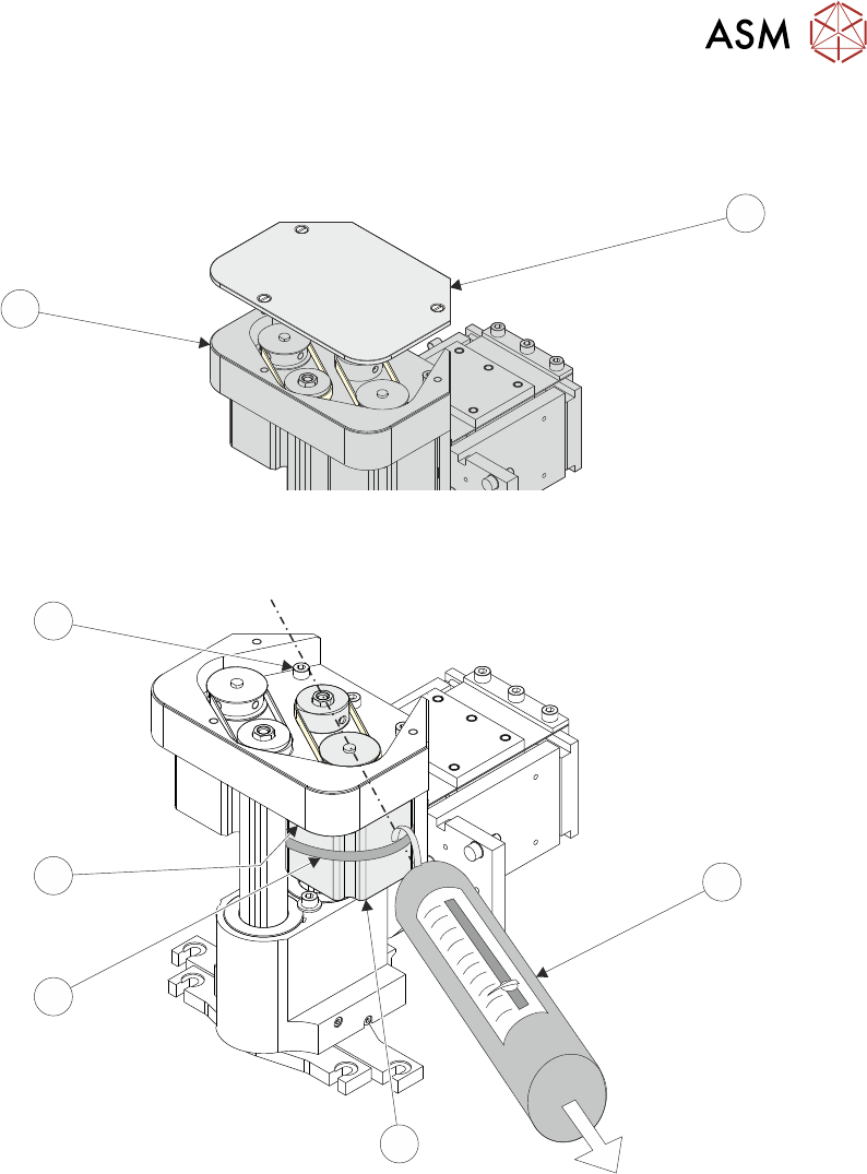 ► Remove the drive belt cover plate (1) from the squeegee printhead mechanism (2) and
