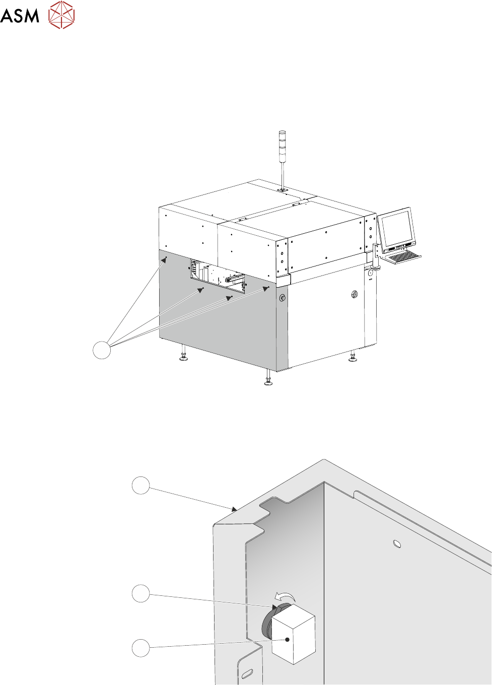 ► To disconnect the E Stop from the lower left side panel (4), turn the latch (3) anti-clockwise