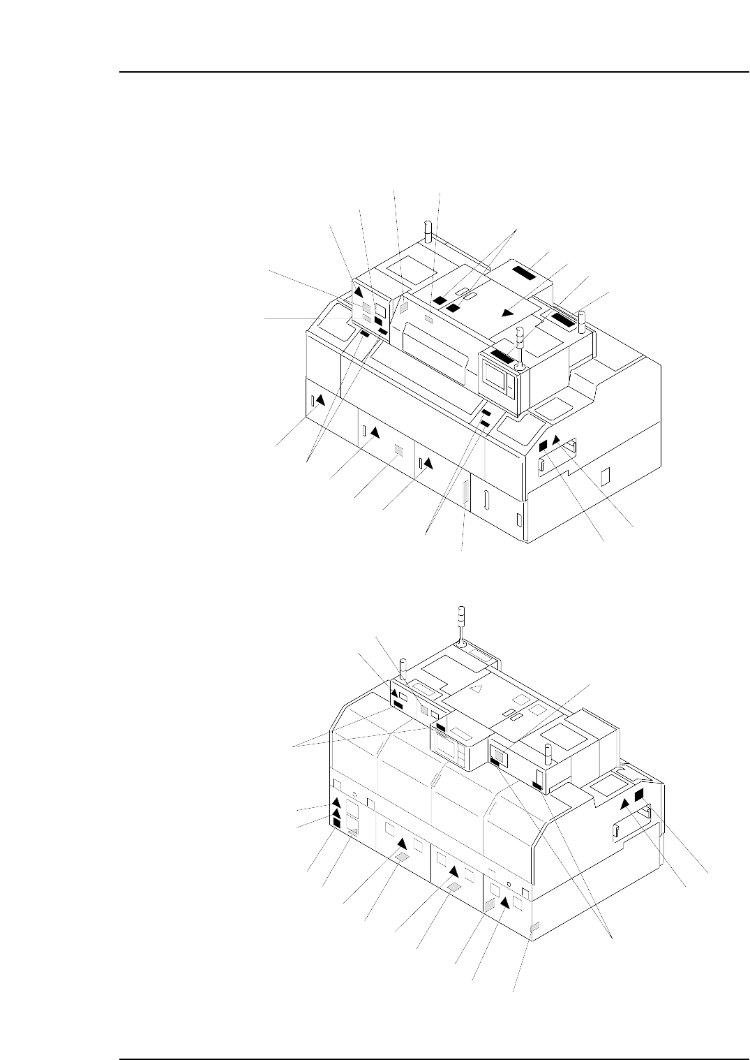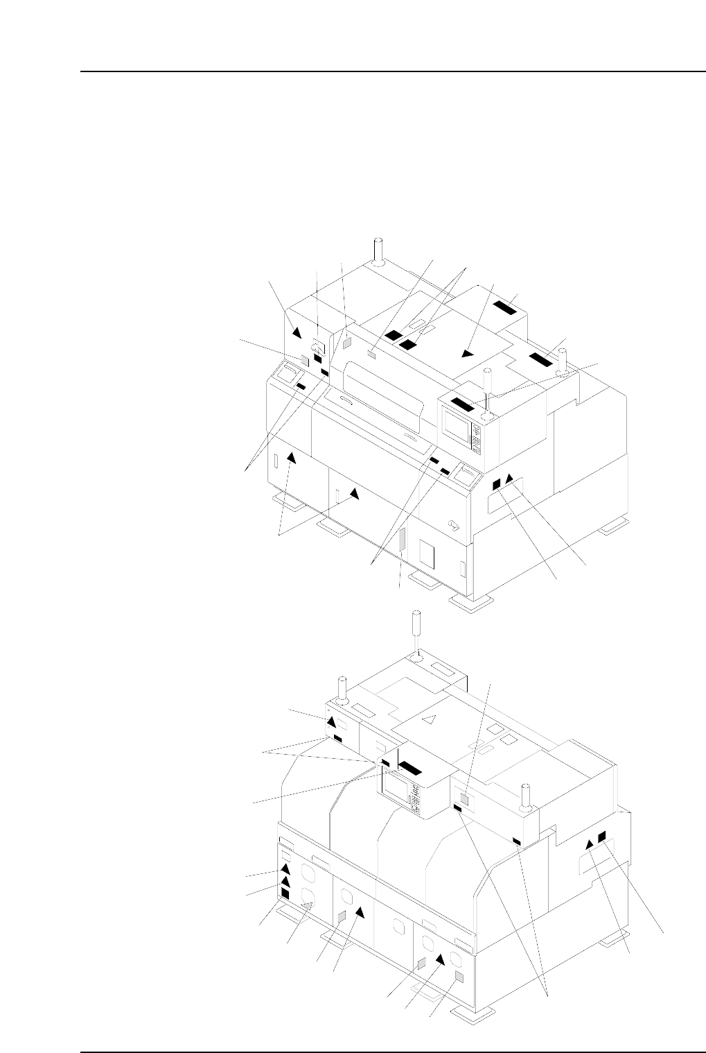4. Safety Labels To warn the operator of hazards, safety labels are attached to the machine at the positions indicated in the figure below. Familiarize yourself with each label and its message before operating the machin…