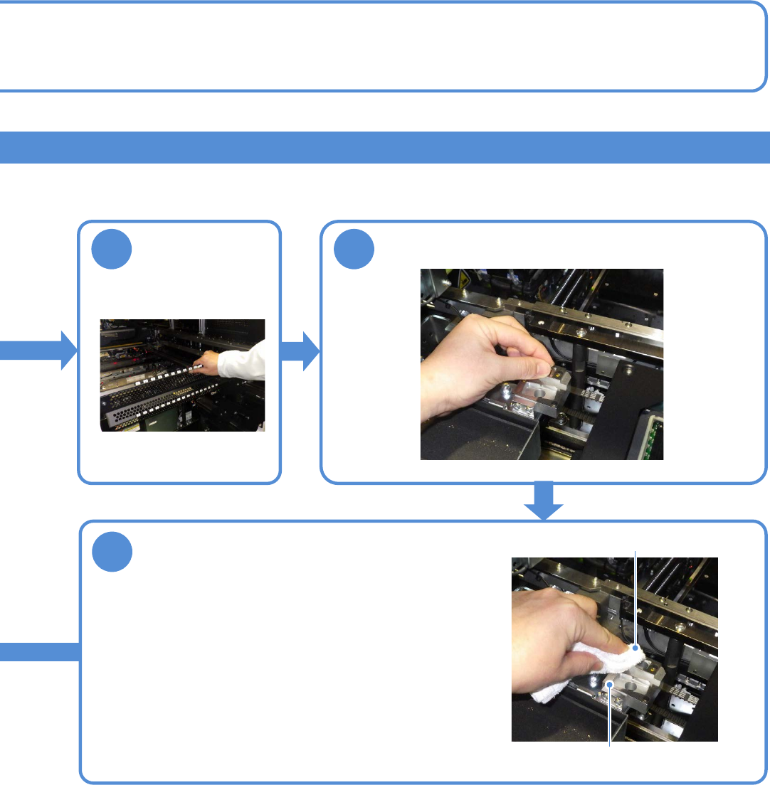 EJM8D C - MB - 04E - 00 NPM - DX OFF SERVO ON OFF SERVO ON 4- 18 -1 XY 轴的电 缆护链的清扫 工程师手册 4 - 18 2 8 XY 轴的电缆护链的 清扫 6 将贴装头和 X 臂移动到 不会碰到机械止动器 的位置 1 卸下交换台车 ( → P.2 - 4) 3 7 安装交换台车 ( → P.2 - 4) 9 使用工具 : 棉纱布 、 棉棒 所需时间 : 5 分钟