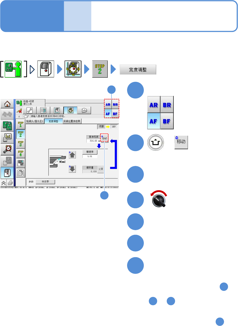 EJM8D C - MB - 10E - 00 NPM - DX 宽度调整 1 7 5 4 2 + ● 传送带宽度为基准宽 度的 316 mm 伺服开关置于 OFF 打开安全盖 使用游标尺测定传送带宽度 10 -5 -1 对传送带宽度调 整的校准方法 进行说明。 工程师手册 10 - 5 6 卸下供料器工作台盖 ( → P.2 - 5) 3 卸下交换台车 ( → P.2 - 4) 1 1 2 选择要进行宽度调整的工作台 ●如果测定值是在…