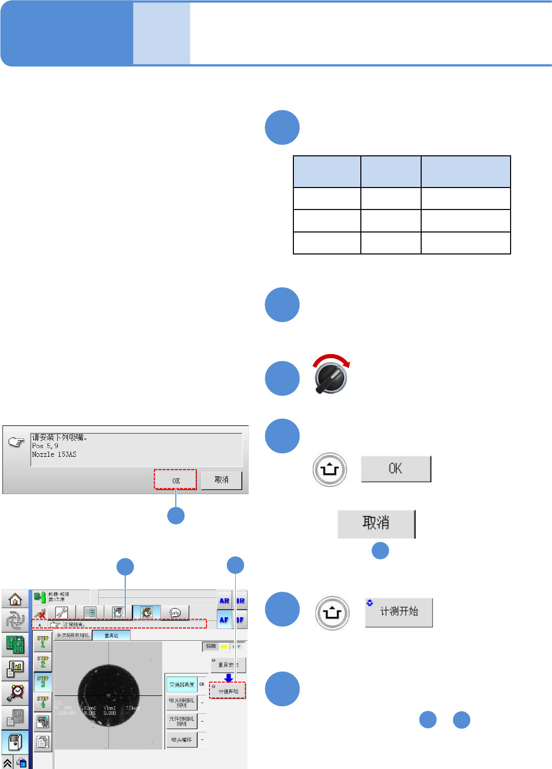 EJM8D C - MB - 10E - 00 NPM - DX 11 12 伺服开关置于 ON 关闭安全盖 + 确认提示 ■取消时 ( 仍然是 的画面 ) 2 13 10 - 10 -4 16 17 伺服开关置于 OFF 打开安全盖 15 准备安装吸嘴 + 确认提示 ■取消时 ( 仍然是 的画面 ) 2 14 ( 贴装头移动到作业位 置 ) 10 ● 确认 LED 指 示定是 否亮灯。 把治具站的电源开关设定为 ON 13 14