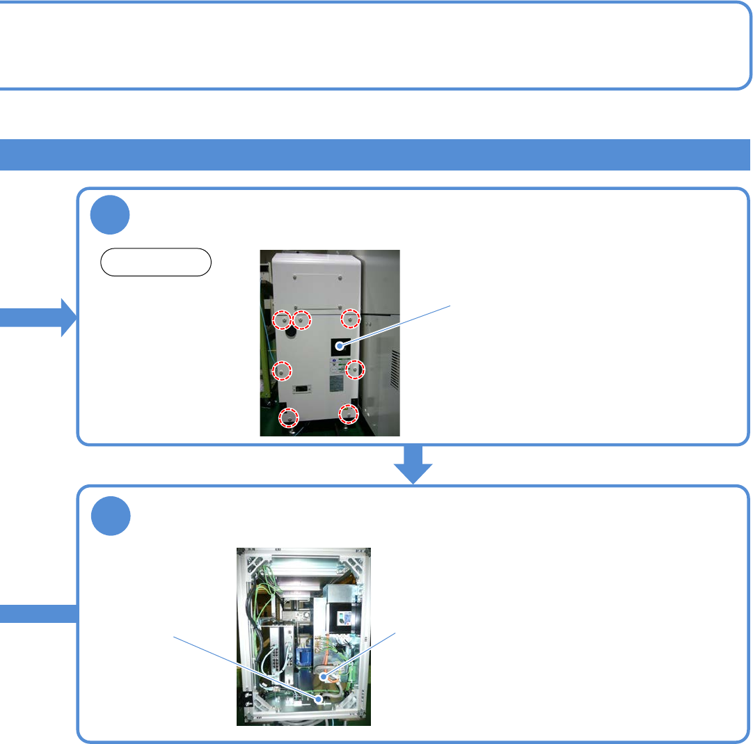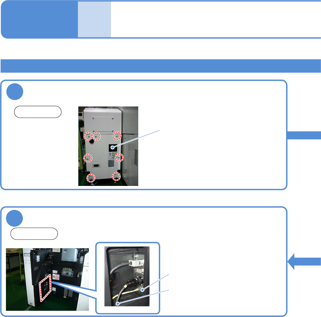 SEJM8DC - MB - 11E - 00 NPM - DX 3 4 11 -6-4 -2 确认主电源开关处于 OFF ,然后拆卸盖 ① 卸下电缆扣 。 ② 松开电缆夹后将电源 电缆穿 过下部 的孔。 主电源开关 电缆扣 电缆夹 后侧 ● 螺丝 : 7 个 使电缆穿过电缆夹、电缆扣