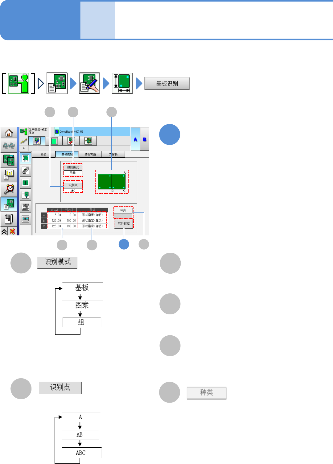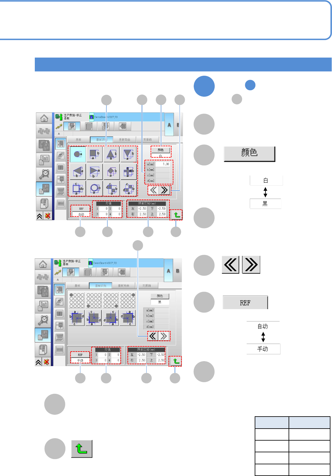 EJM8D C - MB - 12E - 00 NPM - DX 12 -1-3 -2 B A C D E F H G E F G D A C B 形状选择和修改 H E F G D H 2 1 E 指示灯值 照 明种类 1 同轴照明 2 高角度 照明 3 中角度照明 4 低角度照明 尺寸 选择识别标记的 颜色。 形状选择 选择的识别标记 的形状的尺寸 。 选择识别标记的 形状。 在步骤 ( → P. 1 2 -1 -3- 1) 的画面…