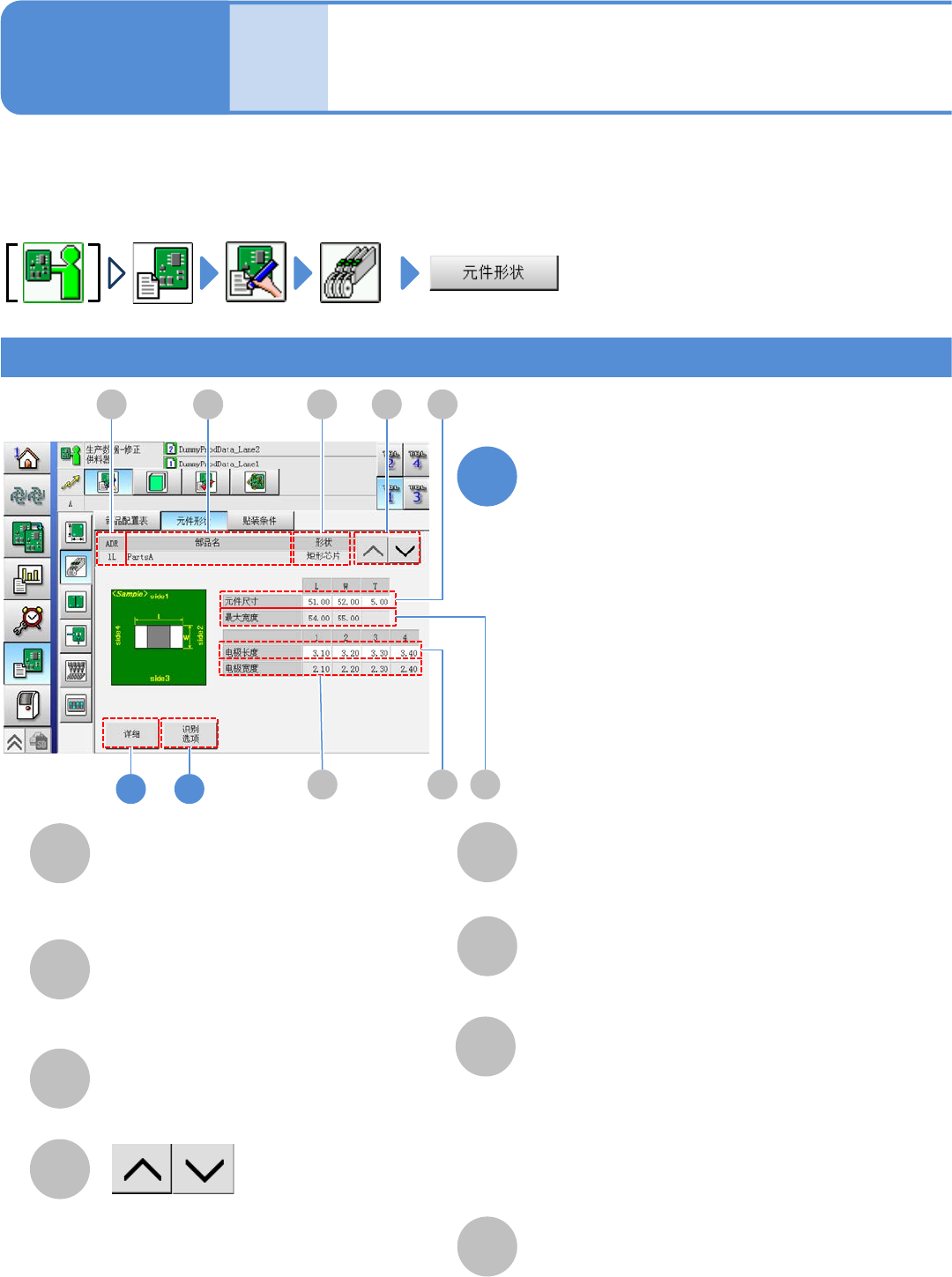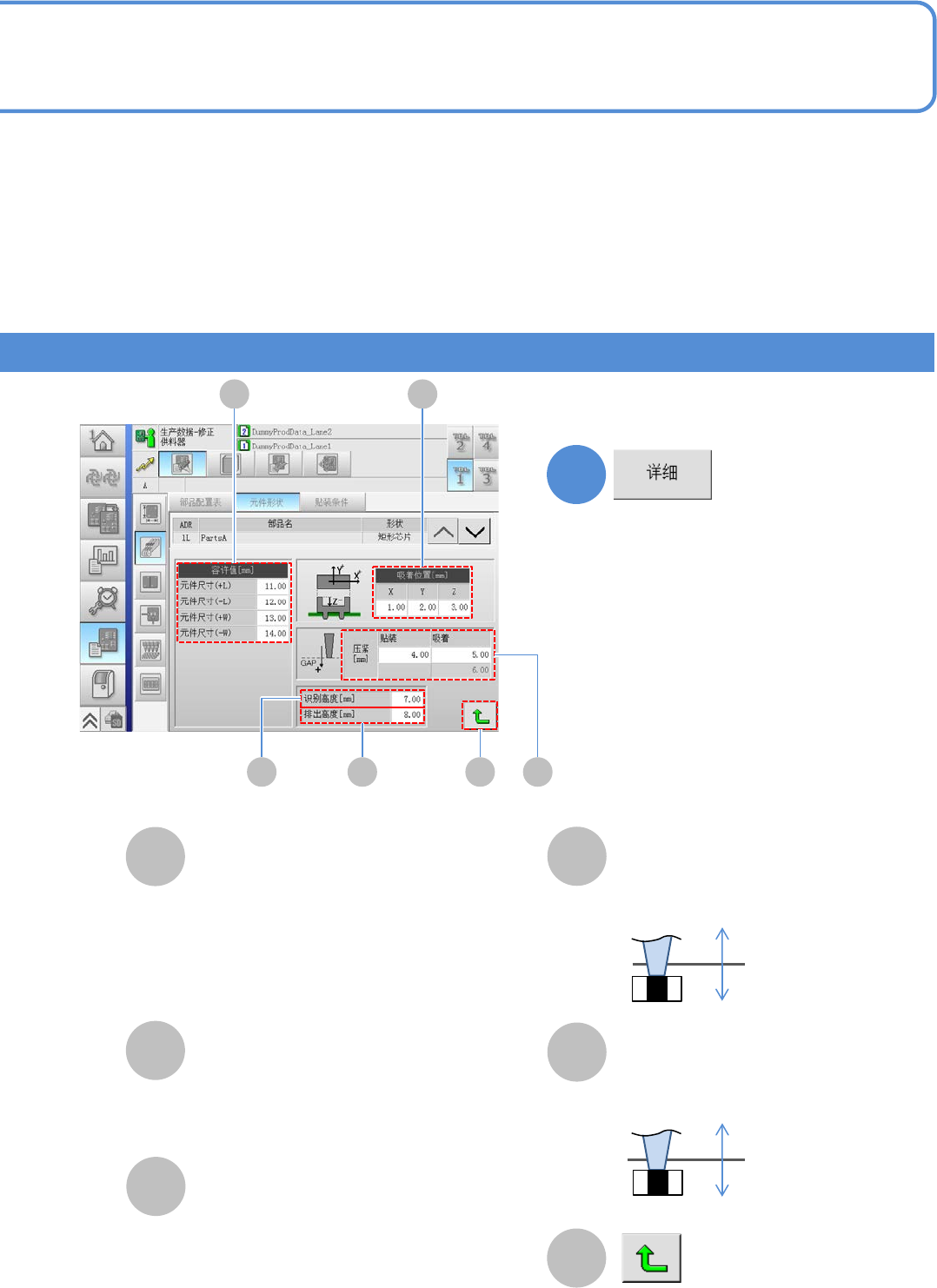 EJM8D C - MB - 12E - 00 NPM - DX A B D C E + - + - 12 -1-8 -2 2 F 元件尺寸的容许值 识别高度 ●+ L: + 方向的元件长度 的容许 值 。 ●- L: -方向 的元件长度的容许值。 ●+ W : +方向 的元件宽度的 容许值。 ●- W : -方向 的元件宽度的 容许值。 输入识别高度。 对详细数据进行 确认、修改。 吸着位置 压紧 ● 贴装 : 贴装压紧 [ mm ]…