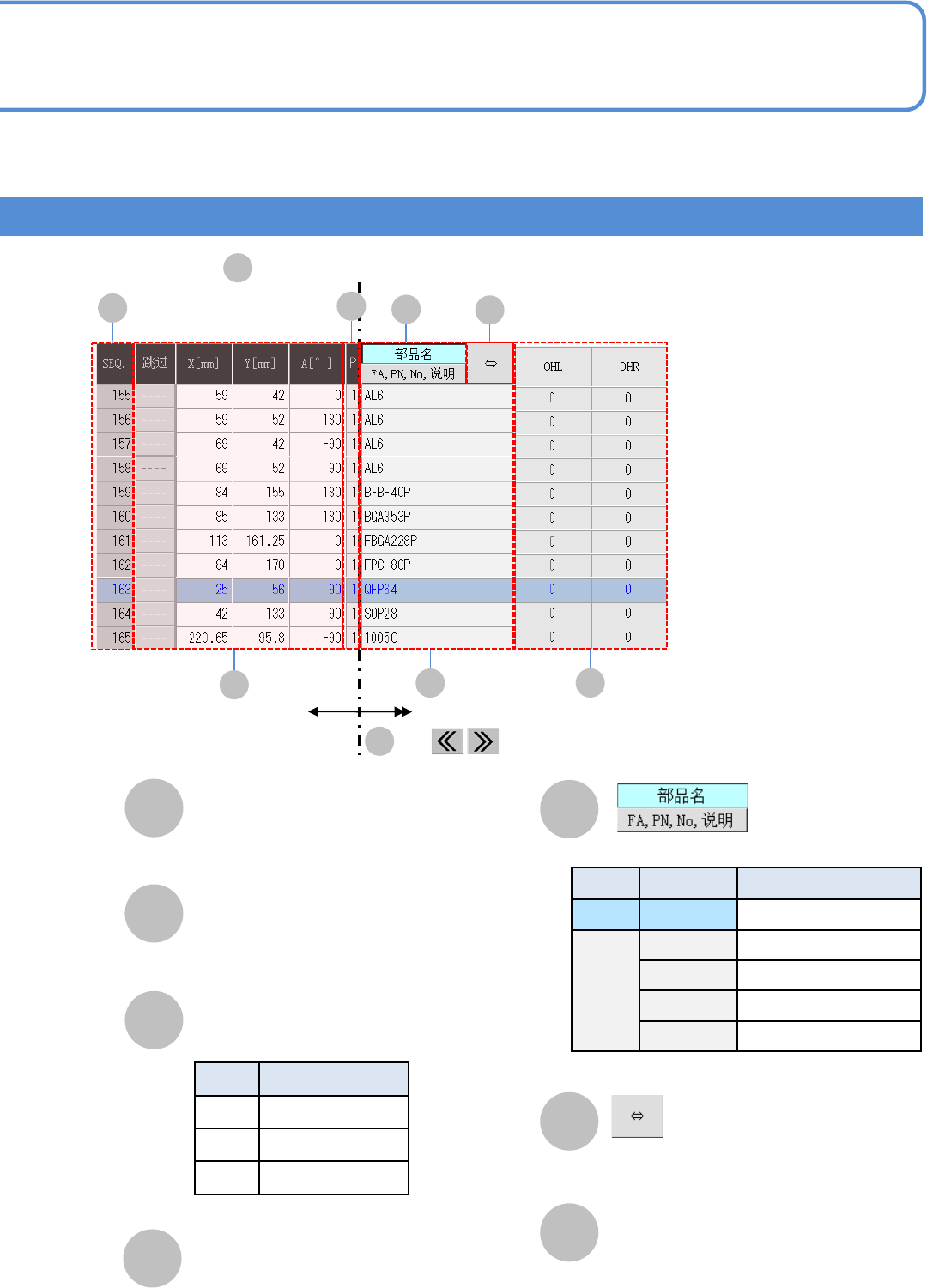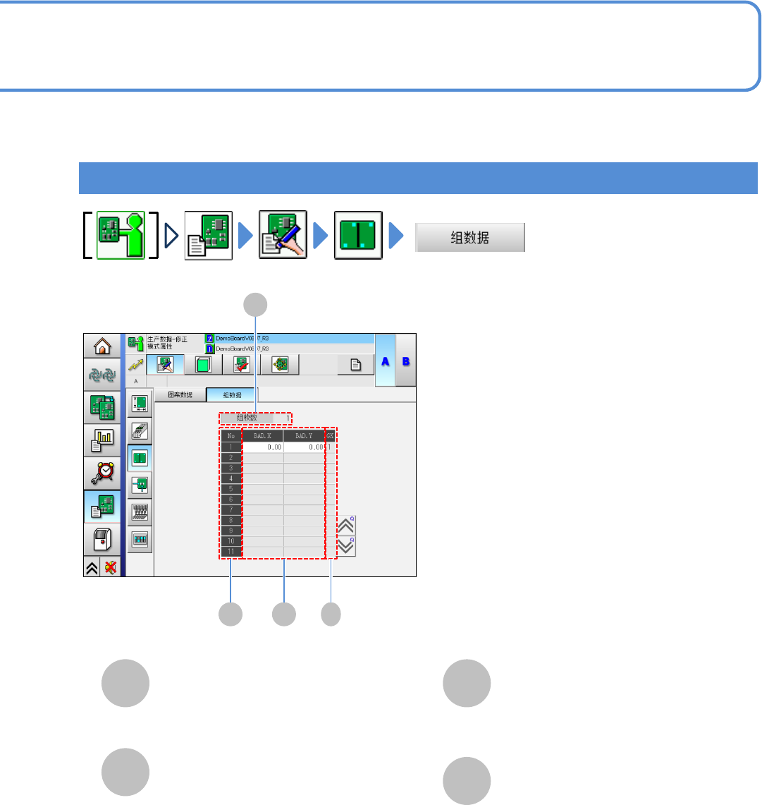 EJM8D C - MB - 12E - 00 NPM - DX 12 -1- 12 -1 D E F A C 生产数据信息 ( → P.12 -1- 13 -2 ) B E A B C 数据 修改 生产数据的修改 1 G H G F H 画面的说明 1 工程师手册 12 - 1 - 12 D 对生产数据的确 认和修改画面 进行说明。 跳过点数 实装点数 指定跳过的贴装 点总数。 贴装点的总数。 ( 往右滚动一览表 ) ●有贴装点的识 …