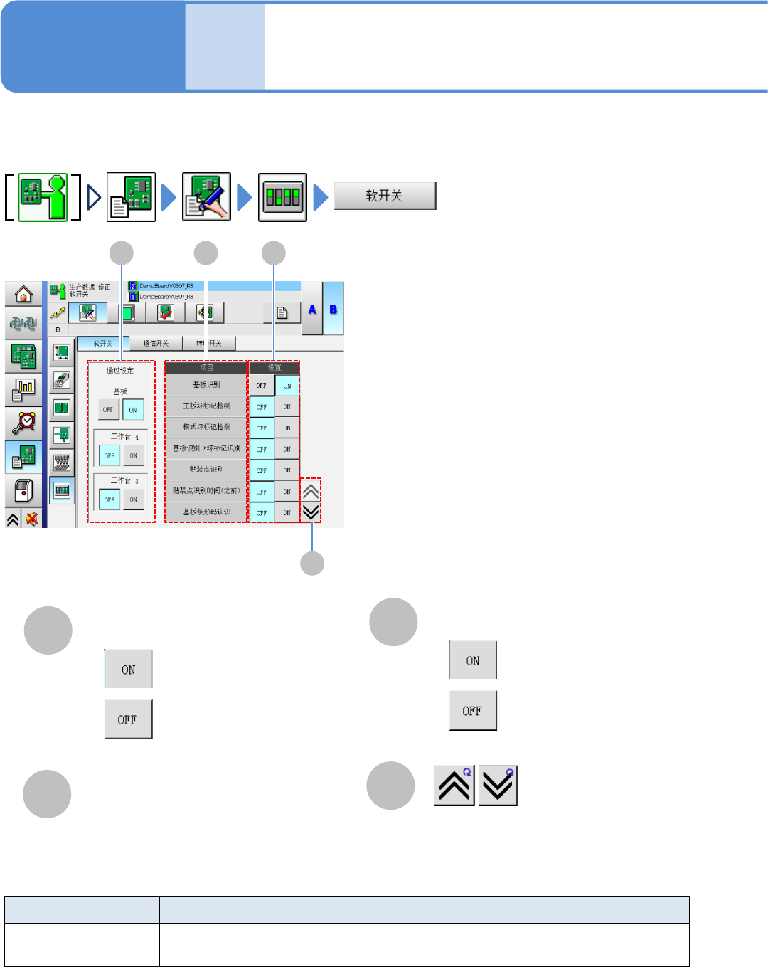 运转条件的设定和工作台的ON、OFF切换。