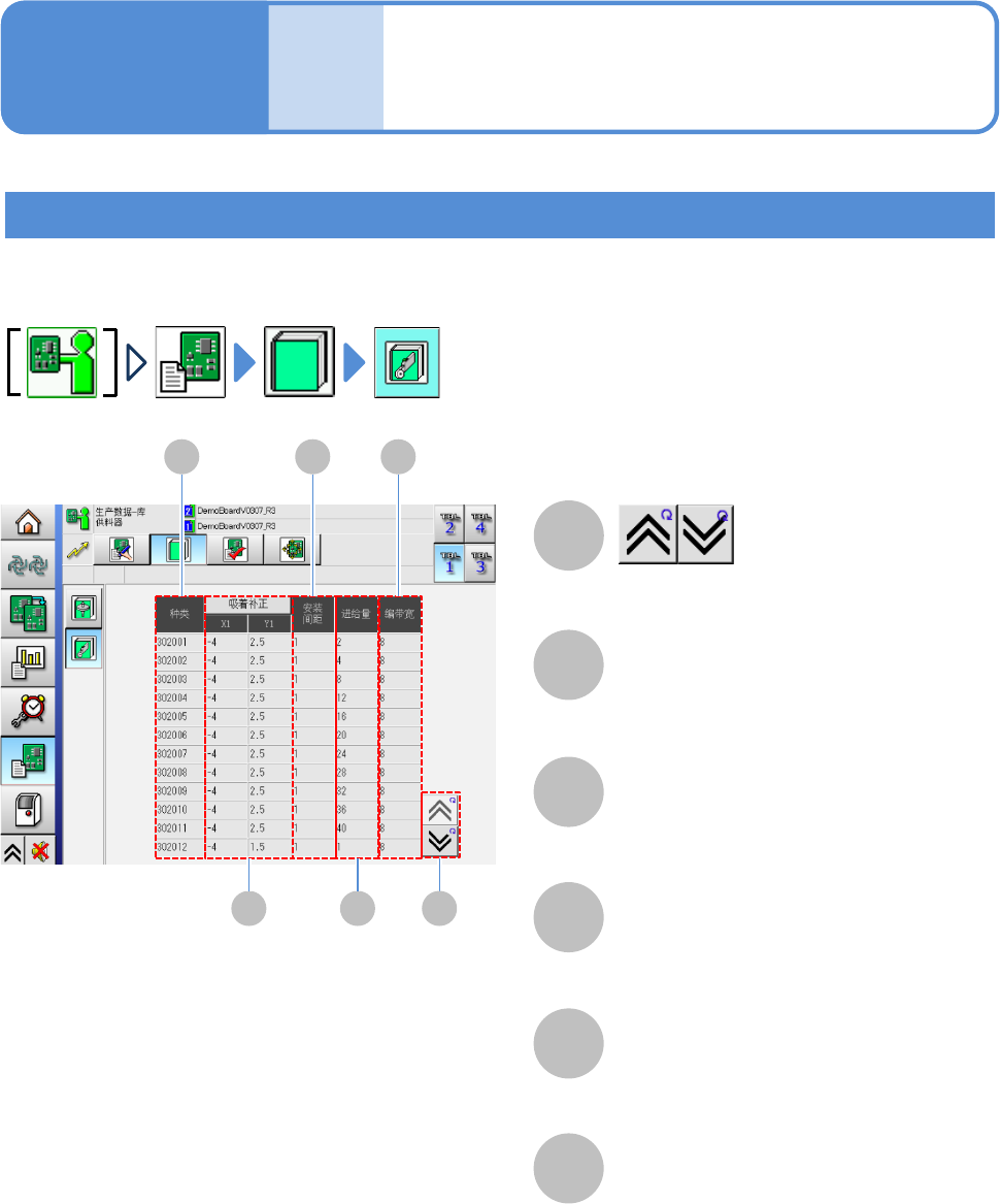 EJM8D C - MB - 12E - 00 NPM - DX 数据 修改 程序库的确认 2 B C D E F 供料器程序库 B C D E F A A 工程师手册 12 - 1 - 14 12 -1- 14 -3 种类 吸着补正 X / Y 安装间距 进给量 编带宽 显示前后画面。 供料器的吸着位 置的补正值。 供料器占有的槽 数。