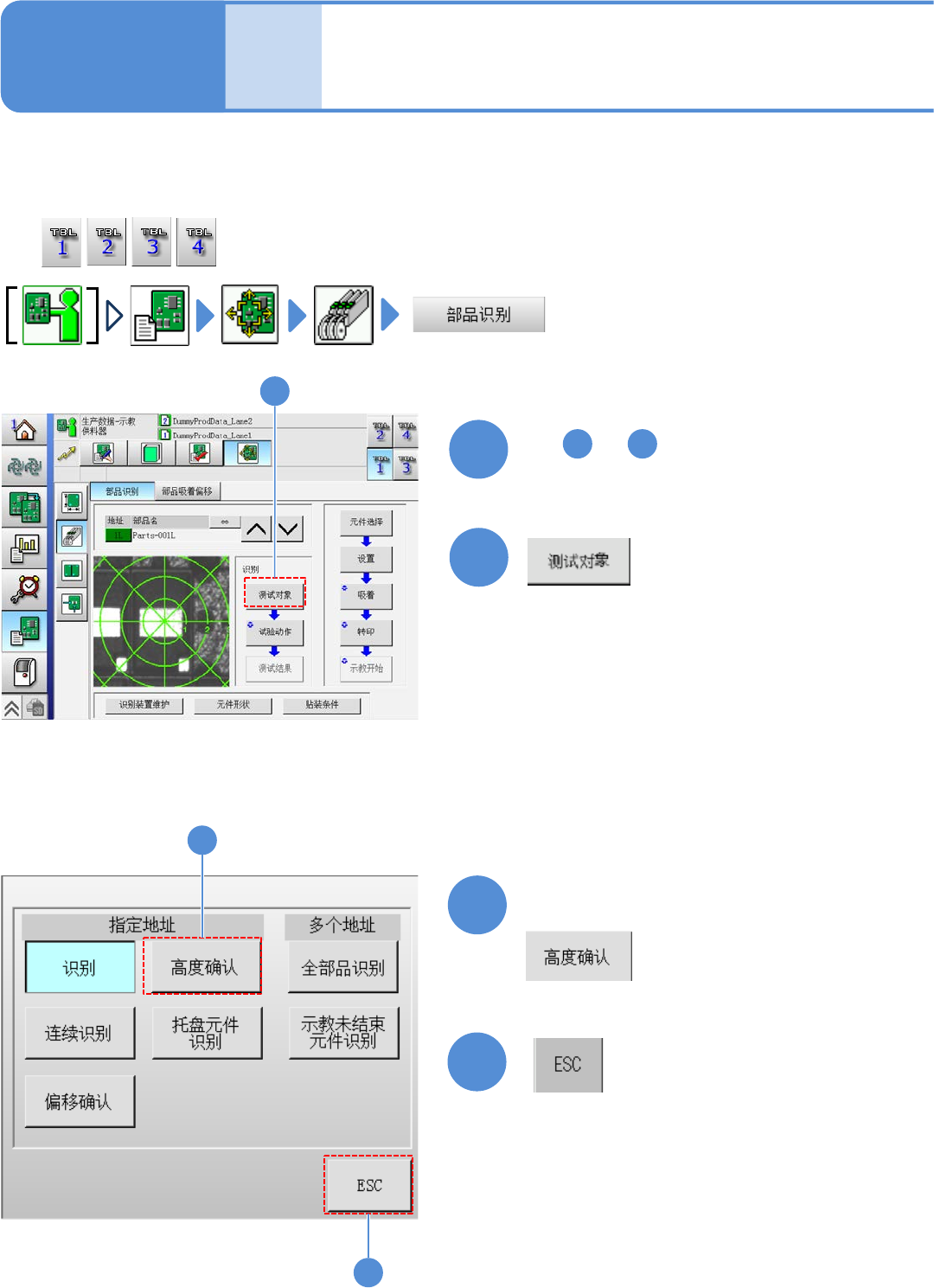 EJM8D C - MB - 12E - 00 NPM - DX 生产数据 示教 贴装 / 吸着 / 转印高度的确 认 2 3 12 -2-7 -1 2 1 工程师手册 12 - 2 - 7 4 使贴装头 的 XYZ 轴动作 ,目视确认 贴装、吸着、转印时 的吸嘴高度, 对其确认方法 进行说明。 选择识别方法 1 15 ● 请全都实施 。 3 4 执行 ~ 的操作 ( → P.12 -2-4)