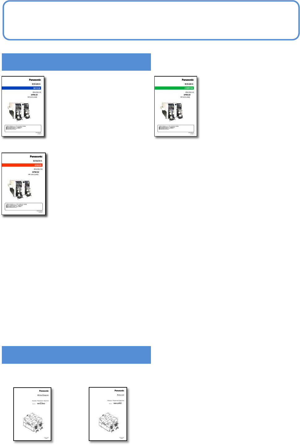 NPM - DX EJM8D C - BP - 01N - 00 S-5 使用说明书的构成 有关使用说明 书的构成 其他附属品 ●零件一览 ●电气配线图 ・ APC 系统 ・ LNB ・ NPM - DGS ・ PanaCIM - EE ・ 智能编带 供料器 根据设备选项构 成,附属上述 使用说明书。 请按照内容,参 考相应的各种 使用说明书。 准备和使用方法 ■操作手册 对于从 材料 供给等的生产准备、 到数据设定、修正方法 等,以 …