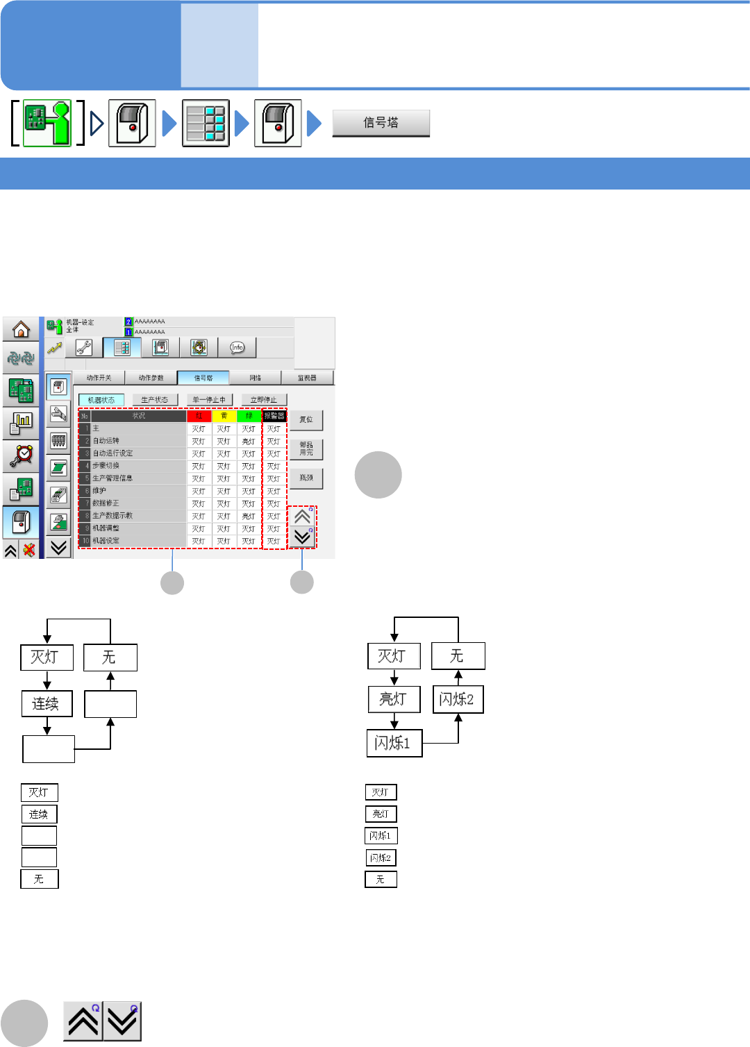 EJM8D C - MB - 13E - 00 NPM - DX 单元设定 信号塔的设定 1 13 -1-3 -1 A B 工程师手册 13 - 1 - 3 A B 机器状态 / 生产状态 / 单一停止 / 立即停止 ●根据 各种 不同情况设定指示 灯和报警器。 设定分为 [ 机器状态 ] 、 [ 生产状 态 ] 、 [ 单一停止 ] 、 [ 立即停止 ] 。 当在设备内发生 多个“状况” 时,优先度最 高的项目设定内容将 反映到信号塔…