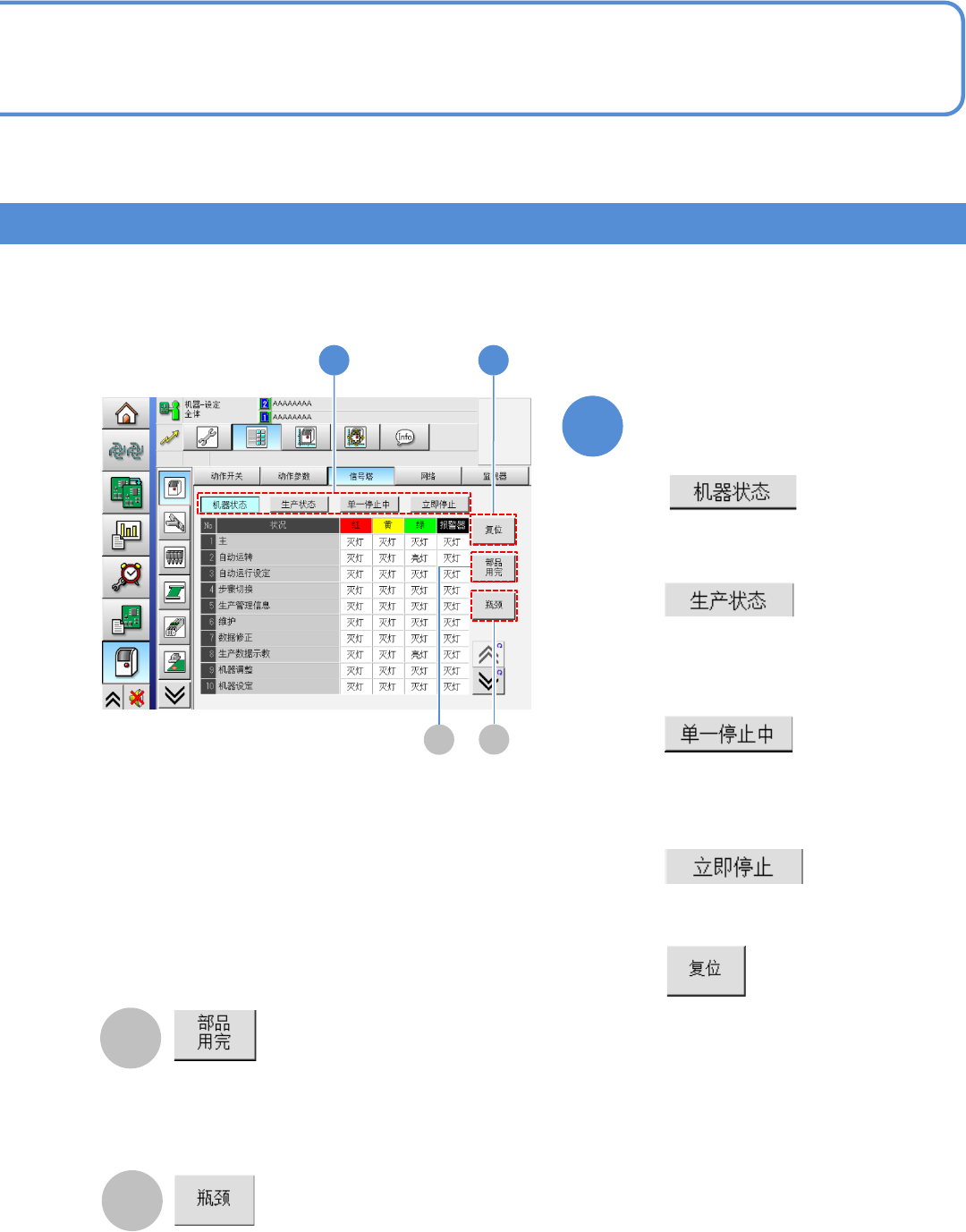 设定分为[机器状态]、[生产状态]、[单一停止]、[立即停止]。