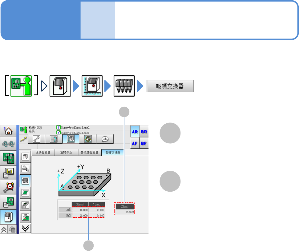EJM8D C - MB - 13E - 00 NPM - DX 机器参数 13 -3-7 交换器高度的 确认 确认吸嘴交换器 高度的偏移值 ( 校准的结果 ) 。 工程师手册 13 - 3 - 7 B A 吸嘴交换器高度 Z [mm] 吸嘴交换器的高 度方向的偏移 值。 A 、 B 点的坐标 X [mm] / Y [mm] B A