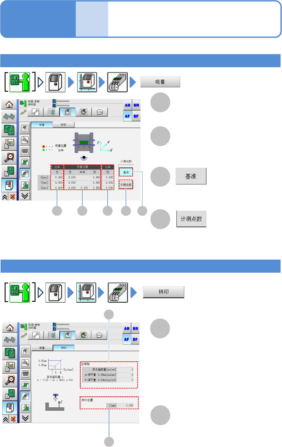 EJM8D C - MB - 13E - 00 NPM - DX 机器参数 供料器吸着位置 A B A B 供料器吸着位置 / 转印 位置偏移量的确认 A 工程师手册 13 - 3 - 10 转印位置偏移值 A B A B C D C D 台车位置的偏移值 X[mm]/Y[mm]/Z[mm] 左右台车位置的 偏移值。 吸着位置的偏移值 X[mm]/Y[mm]/Z[mm] 供料器的吸着位 置的偏移值。 (X/Y/Z 坐标 ) 显示在校准时…
