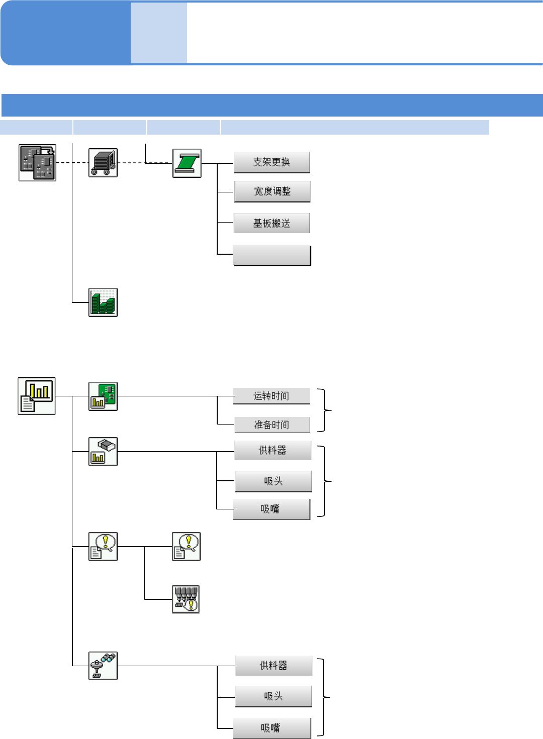 EJM8D C - MB - 02C - 00 第 1 阶层 第 2 阶层 第 3 阶层 第 4 阶层 NPM - DX 2-2-2 -4 更换消磨零件 定期检查 确认各周期的检 查项目和操作 履历。 显示消磨零件的 更换信息。 维护菜单 XY 单元 进行 XY 单元的维 护作业 。 贴装头 进行贴装头的维 护作业。 维护作业 进行 基板传送的维护作业。 传送带 显示精度验证结 果。 精度 验证结果 生成 数据 生成 精度验证数据。 精…