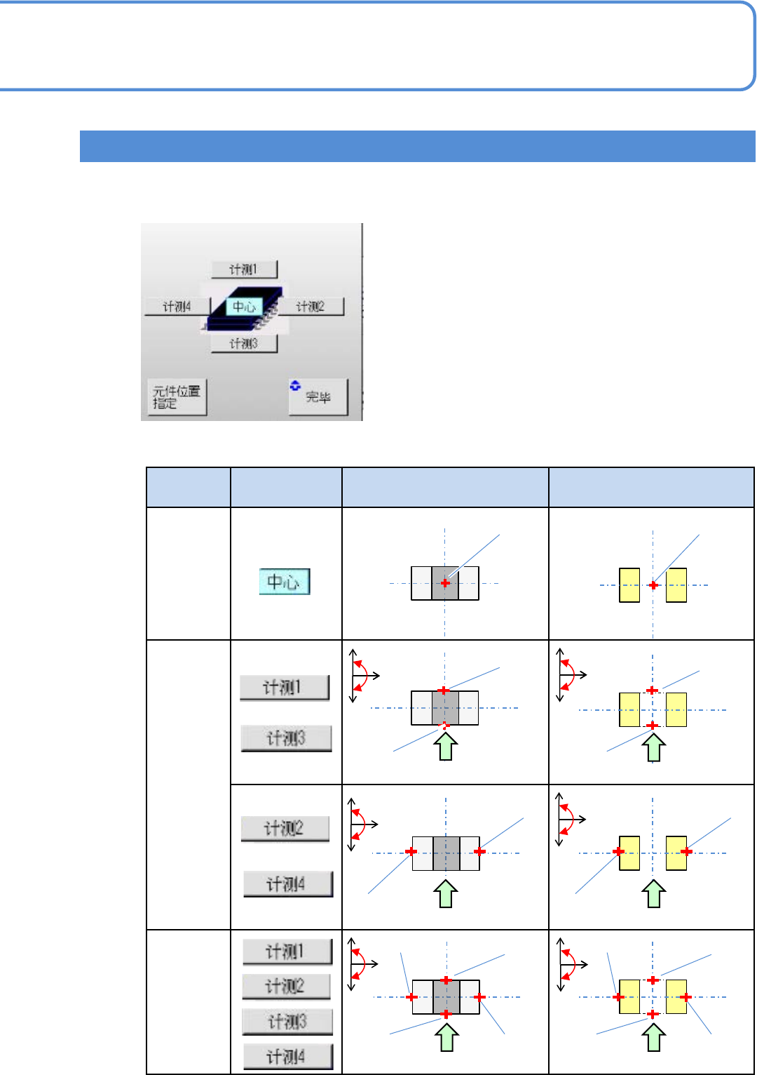 EJM8D C - MB - 12E - 00 NPM - DX 12 -2-9 -4 选择计测位置 计测所选择的位 置,算出元件 的中心坐标或 者基板上电极的中心 坐标。 ■计测位置的设定画面 ■计测方法和计测位置键 计测方法 使用键 元件 基板上的电极 1 点 2 点 4 点 计测 1 计测 3 中心 计测 1 计测 3 中心 计测 2 计测 4 计测 2 计测 4 计测 2 计测 3 计测 1 计测 4 编带的流向 + - + -…