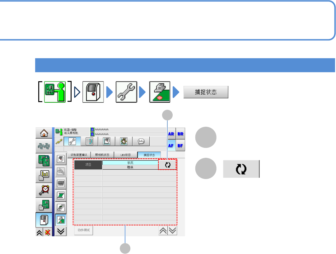 EJM8D C - MB - 13E - 00 NPM - DX 13 -2-9 -5 A B 各项目的状态和错误 C ■ 「动作测试」画面 更新为最新信息 。 显示通信 / 图像的「动作测 试」画面。 显示通信的状态 。 显示测试图像的 状态。 返回原来画面。 显示功能的状态 。 单元调整 贴装头照相机 信息的确认 3 工程师手册 13 - 2 - 9 确认贴装头照相机 的状态 A B C D E G D E G F F