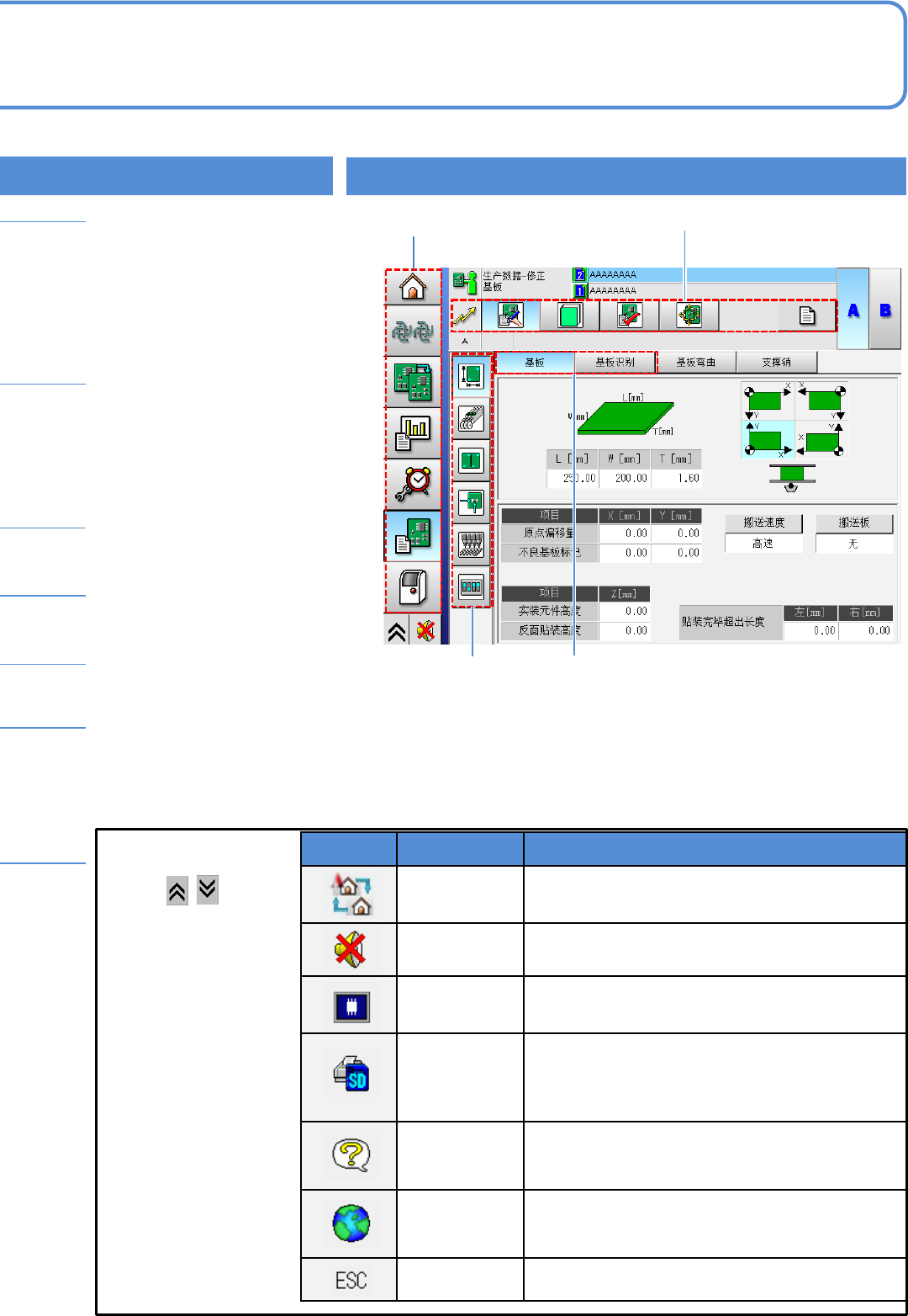 对触摸屏的各区域显示内容进行说明。(对前面的触摸屏画面进行说明。)