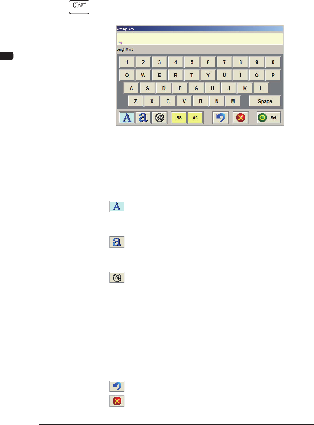 Refer to "3.2 How to enter a string of characters" for the detailed
