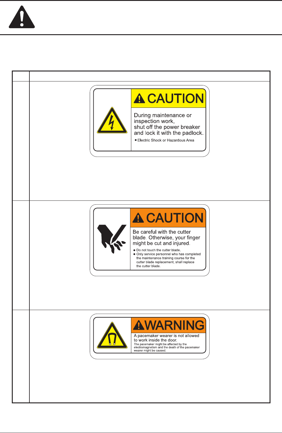 Safety Precautions Safe-23 1OM-1610 Alert Labels and Description No. Alert Labels and Description (1) 10-0280- Description When maintenance or checks are performed, make sure to turn off the power to the machine or air…