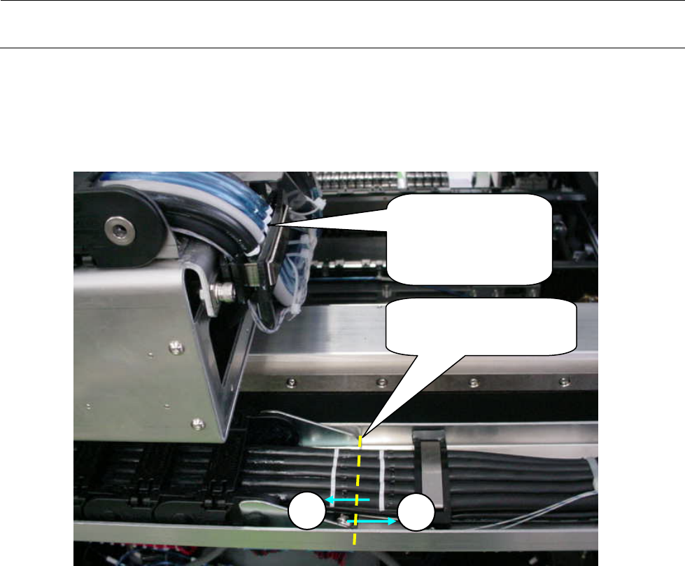 Rev 1.0 维修调整要领书 1-25 1-8-3 . 电缆的装配 1 ) 给各电缆 (40058385、 40044517、 40048070) 放进塑料导轨的部分涂敷润滑油, 按照 X 轴塑料 导轨的 A 向视图配置电缆、气管。 ※ 请注意插座朝向和空气管不要挠曲。 A 向视 图 1-8-3-1 X 轴塑料导轨 XY 拖链电缆 A 向视图 图 1-8-3-2 2 ) 将各电缆、气管穿入后,盖上电缆拖链的盖子。 3 ) 在电缆的贴装…