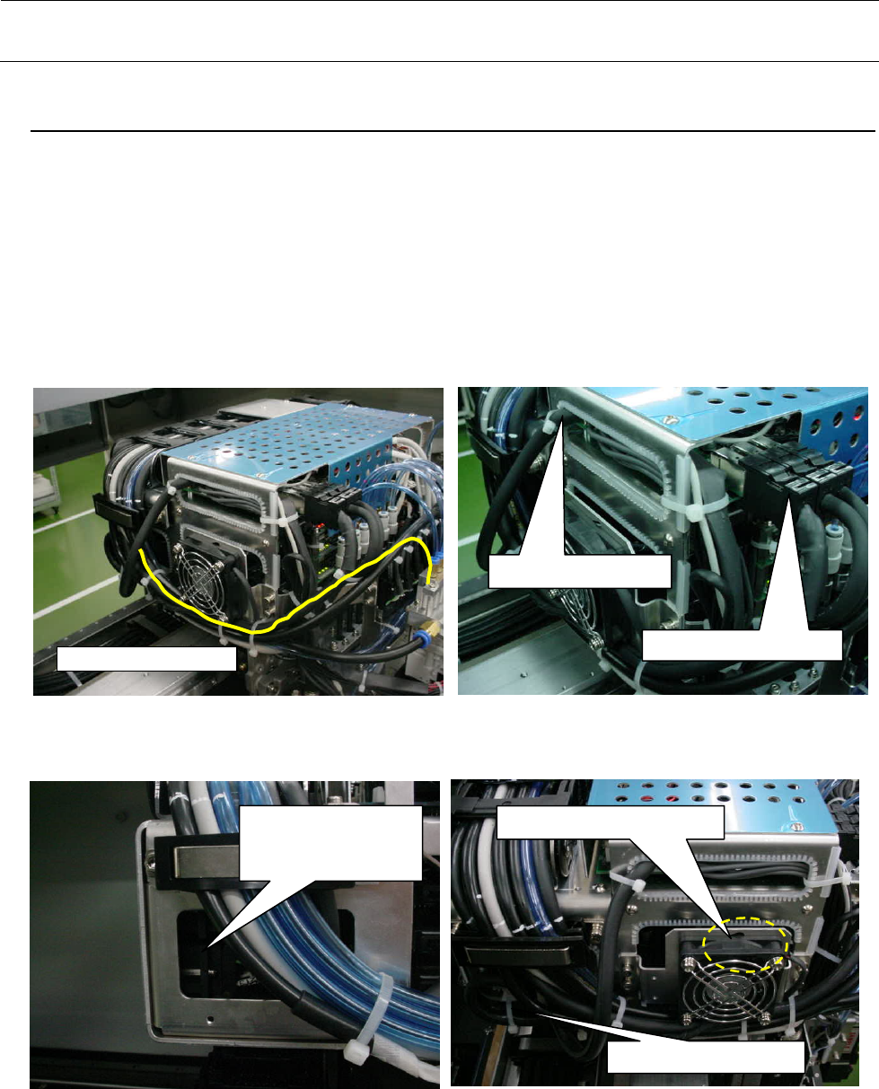 Rev 1.0 维修调整要领书 1-34 1-8-8 . 贴片头周围的配线 将来自 XY 拖链电缆(40058385)的各个束线连接到以下部位。 1 ) CN801 、 CN802 、 CN808 穿过图示的孔,插入贴装头主电路板里侧。 2 ) 摄像机电缆线( CN805 )插入贴装头主电路板的三联插座左侧。 3 ) 电源线( CN211A , B 、 CN212A , B 、 CN213A , B 、 CN214A , B )插入图示…