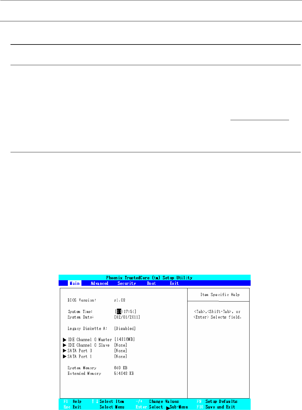 转到 BIOS 设置后,出现如下所示的画面。可用←→键选择菜单画面(Main, Advance, Security, Boot,