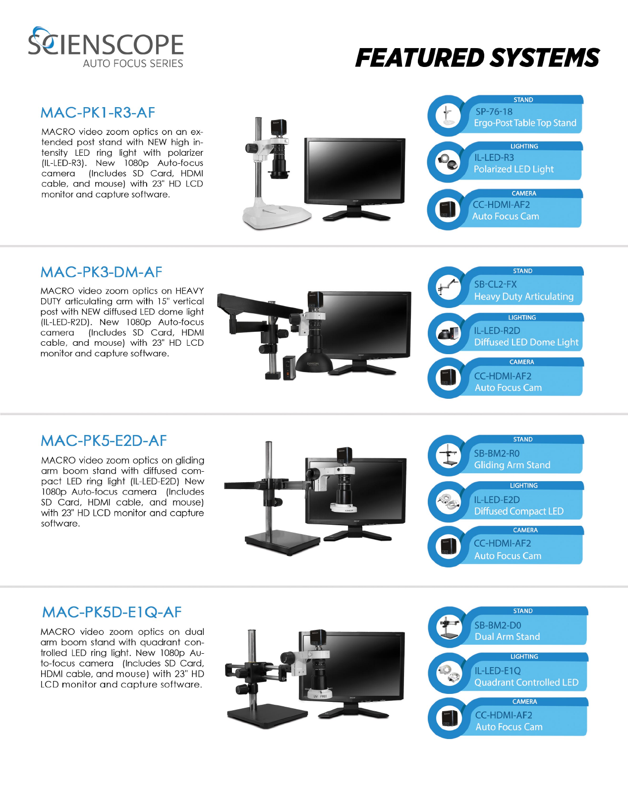 ^ lENSCOPE FEATURED SYSTEMS AUTO FOCUS SERIES ^ ysp - 76 - 18 MAC - PK 1 - R 3 - AF 1 « MACRO video zoom optics on an ex - tended post stand with NEW high in - tensity LED ring light with polarizer ( IL - LED - R 3 ) . N…
