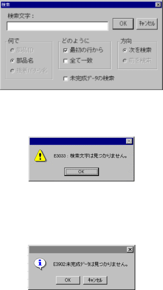 4 - 21 4-3-7. 検索 検索 検索 検索 部品 ID ,または部品名を検索します。検索条件を下図のダイアログで指定し, < OK >ボタンで検 索を開始します。 条件に合う文字が表示されている画面内で見つかった場合は,カーソルがその位 置へ移動し,表示 範囲外に見つかった場合には,その行が画面中央に来るように表示されます。 該当条件で検索できなかった場合は,下図のダイアログが表示されます。 一度入力した検索文字は,次の文字…