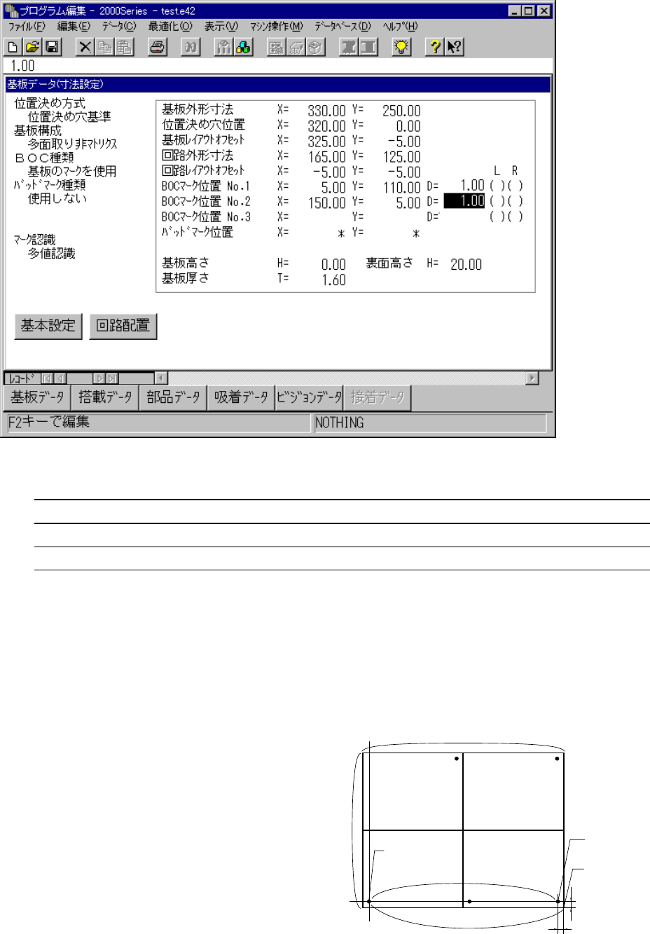 4 - 39 ⑨ BOC マーク位置 マーク位置 マーク位置 マーク位置 No. 1 ∼ ∼ ∼ ∼ BOC マーク位置 マーク位置 マーク位置 マーク位置 No. 3 基本設定で BOC 種類を “基板のマークを 使用”とした場合は,基板 位置基準から BOC マー クの中心点までの寸法を入力します。 基本設定で BOC 種類を “回路毎のマーク を使用”とした場合は,回 路位置基準から BOC マ ークの中心点までの寸法を入力し…