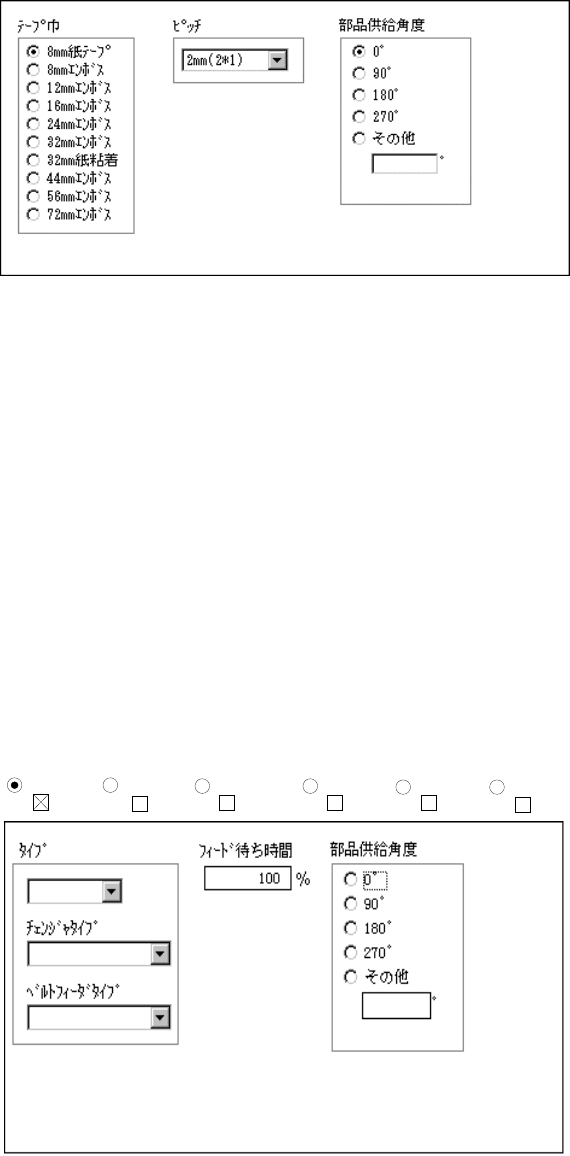 4 - 69 4-7-3. タックコントロール部(荷姿ページ) タックコントロール部(荷姿ページ) タックコントロール部(荷姿ページ) タックコントロール部(荷姿ページ) 1) テープが選択された場合 テープが選択された場合 テープが選択された場合 テープが選択された場合 ① テープ巾 テープ巾をラジオボタンで選択入力します。 ② 送りピッチ テープの送りピッチをコンボボックスで選択入力します。 テープ巾との組み合わせで,フィーダノ…